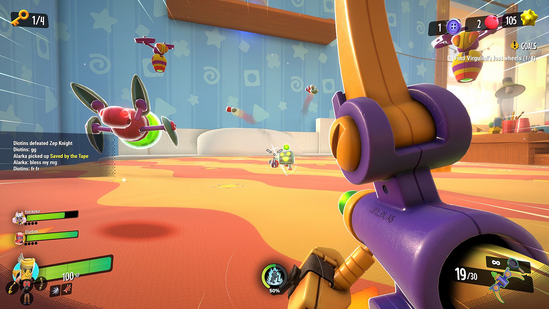 Choose your own route through massive open arenas of the House! Every run brings new layouts, new challenges, and new secrets to discover. Watch out for household hazards - that kiddie pool becomes an ocean when you're toy-sized! Return to your Bedroom HQ to unlock upgrades, chat with sock puppet pals, and prep for the next battle.