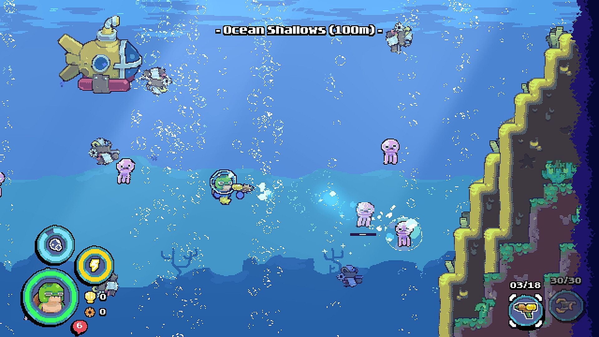 On top of the gelatinous creatures, you will also have other types of resources floating about near the ocean floor to scrap for parts! Use your powerful laser blaster to take apart human trash, crystal rocks, mushrooms, and other distinct components, then use them to upgrade your submarine, tools and more.