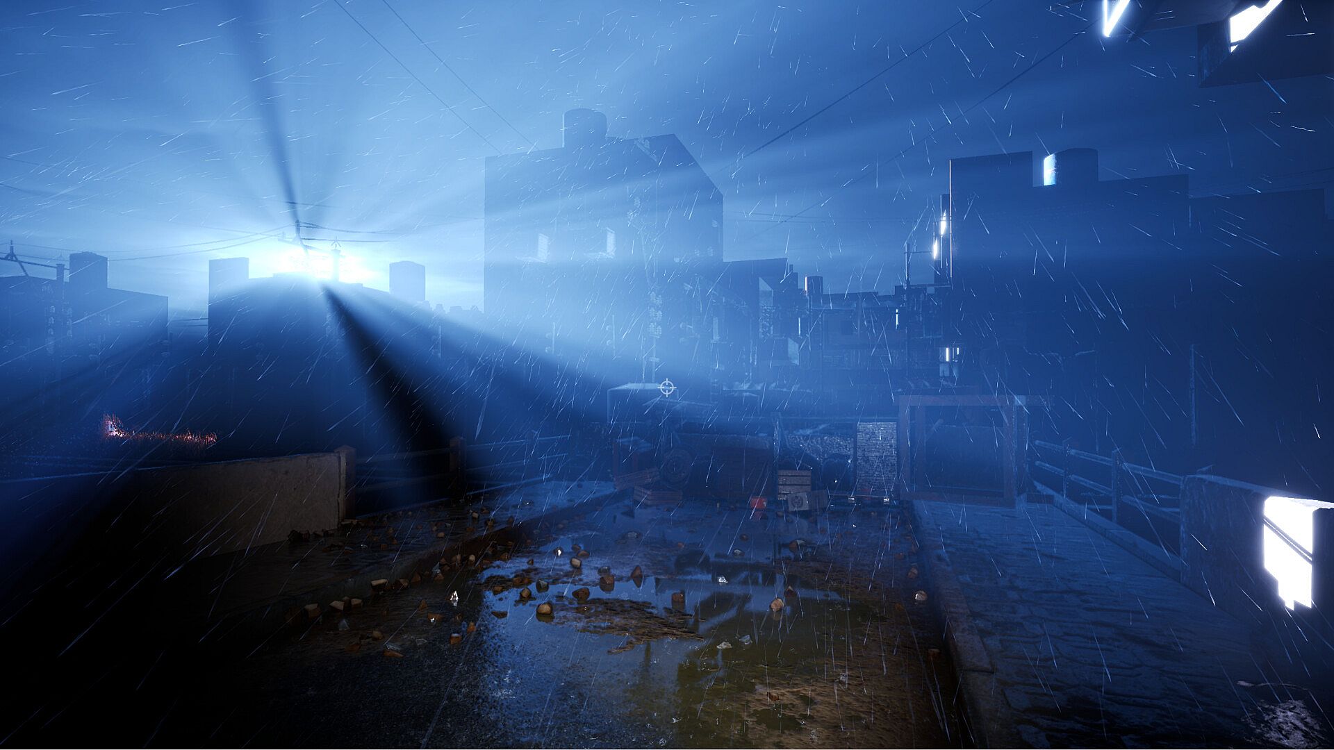 Cinematic Ambience: immersive audio featuring rain, thunder, wind, and distant walkers, layered with subtle ambient music