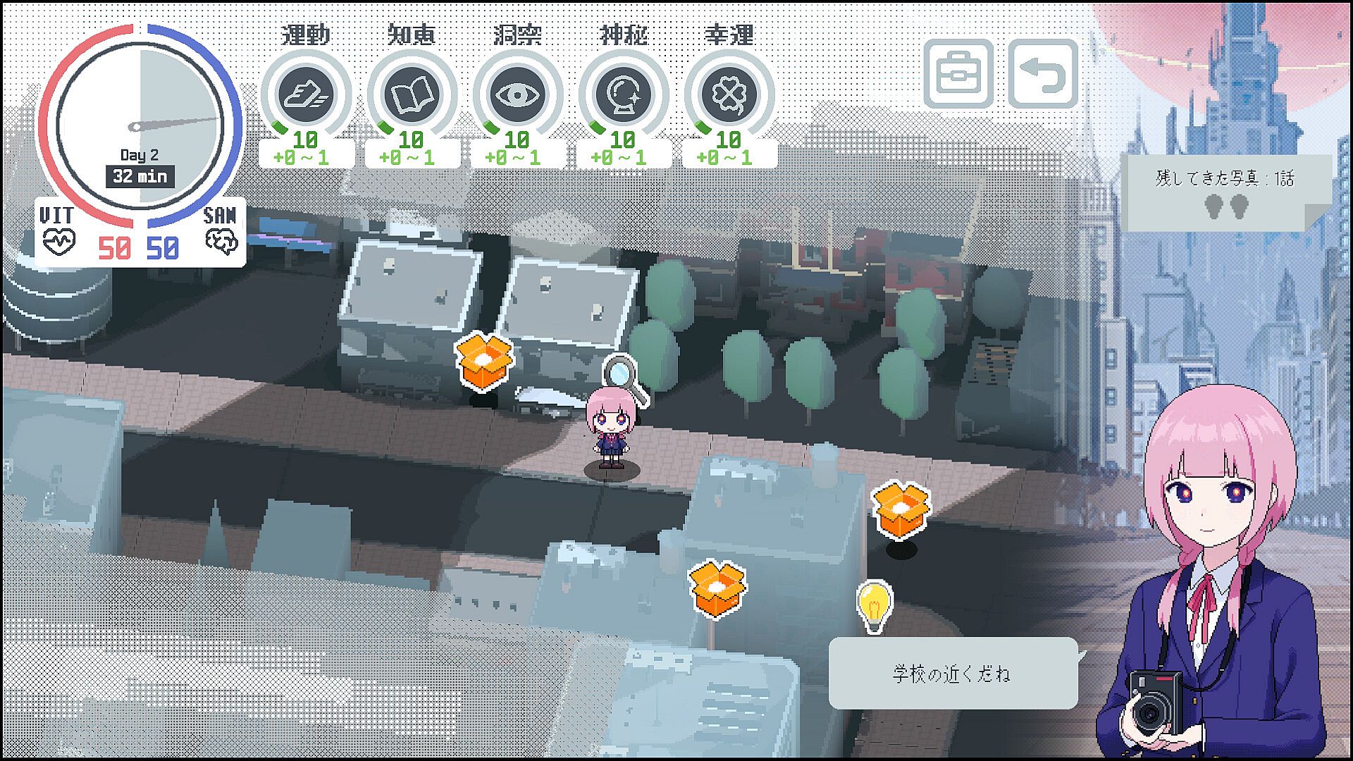 The game is divided into two modes: "Story segments" where you hang out with the members at school, and "investigation segments" where you explore and investigate Kamitsubaki City.