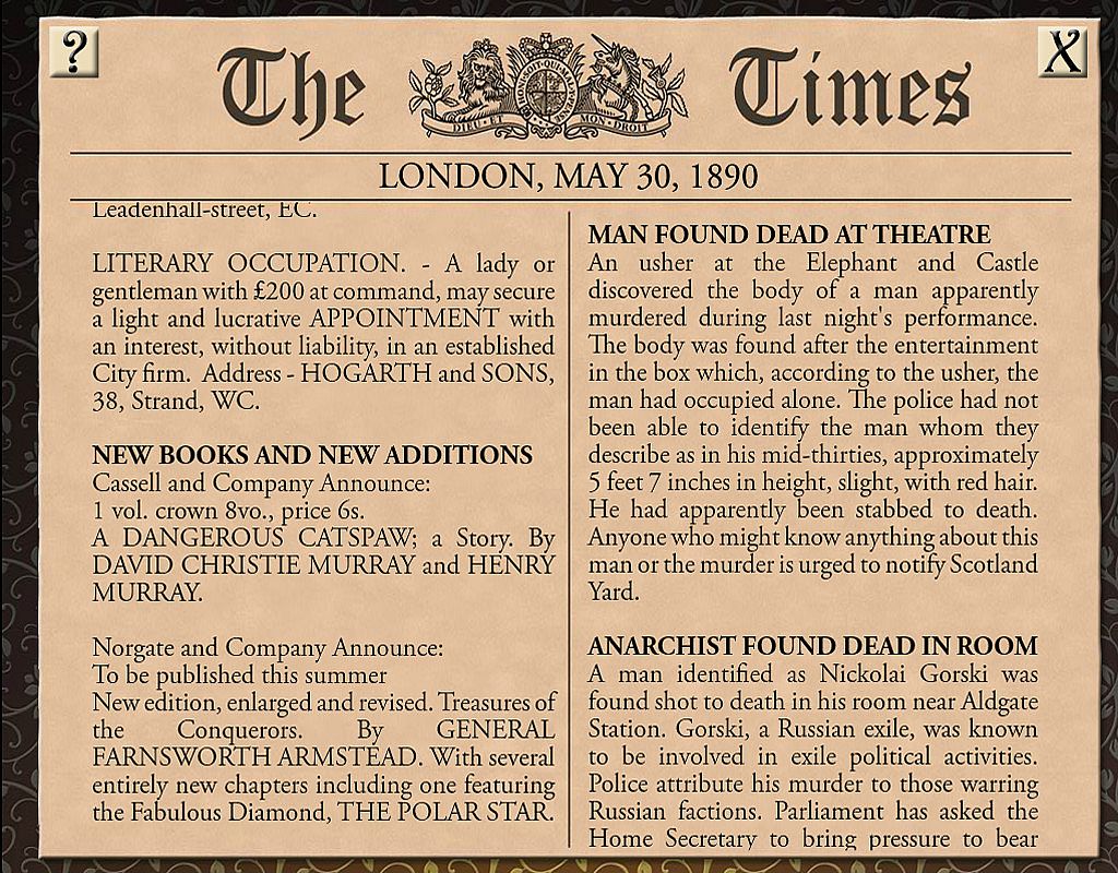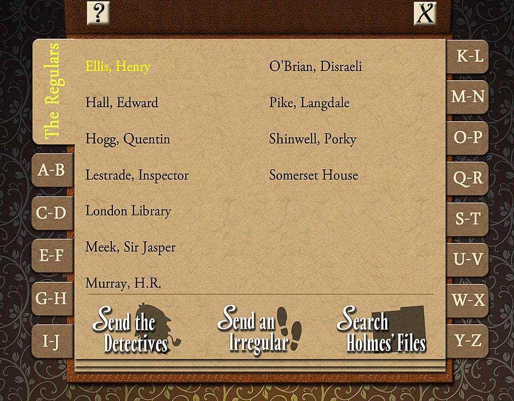• Search the London Times for clues, peruse Holmes’ personal files, scour through the London Directory and receive hints from Watson himself