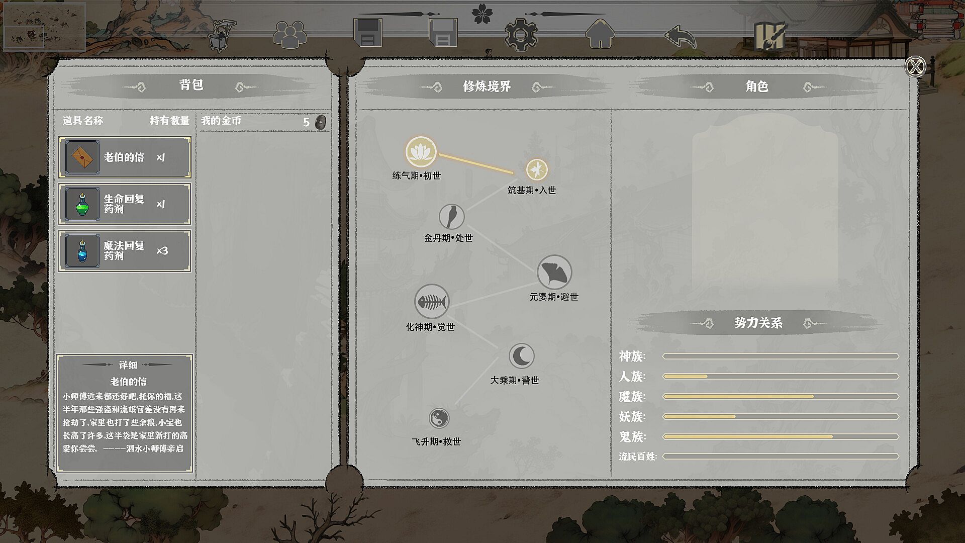 At present, the game is mainly based on the growth of RPG adventure style, and in the future, it will continue to enrich the world view and plot of the game, and consider adding herbal planting system, herbal medicine, sorcerer refining system, force relationship warring system, good and evil judgment reward and punishment system (such as: Do a lot of evil to do a good job of the lightning storm that may be suffered after random days, a strong character may come to become a teammate after a wide friendship), and the goodwill and loyalty system of interacting with NPCS.