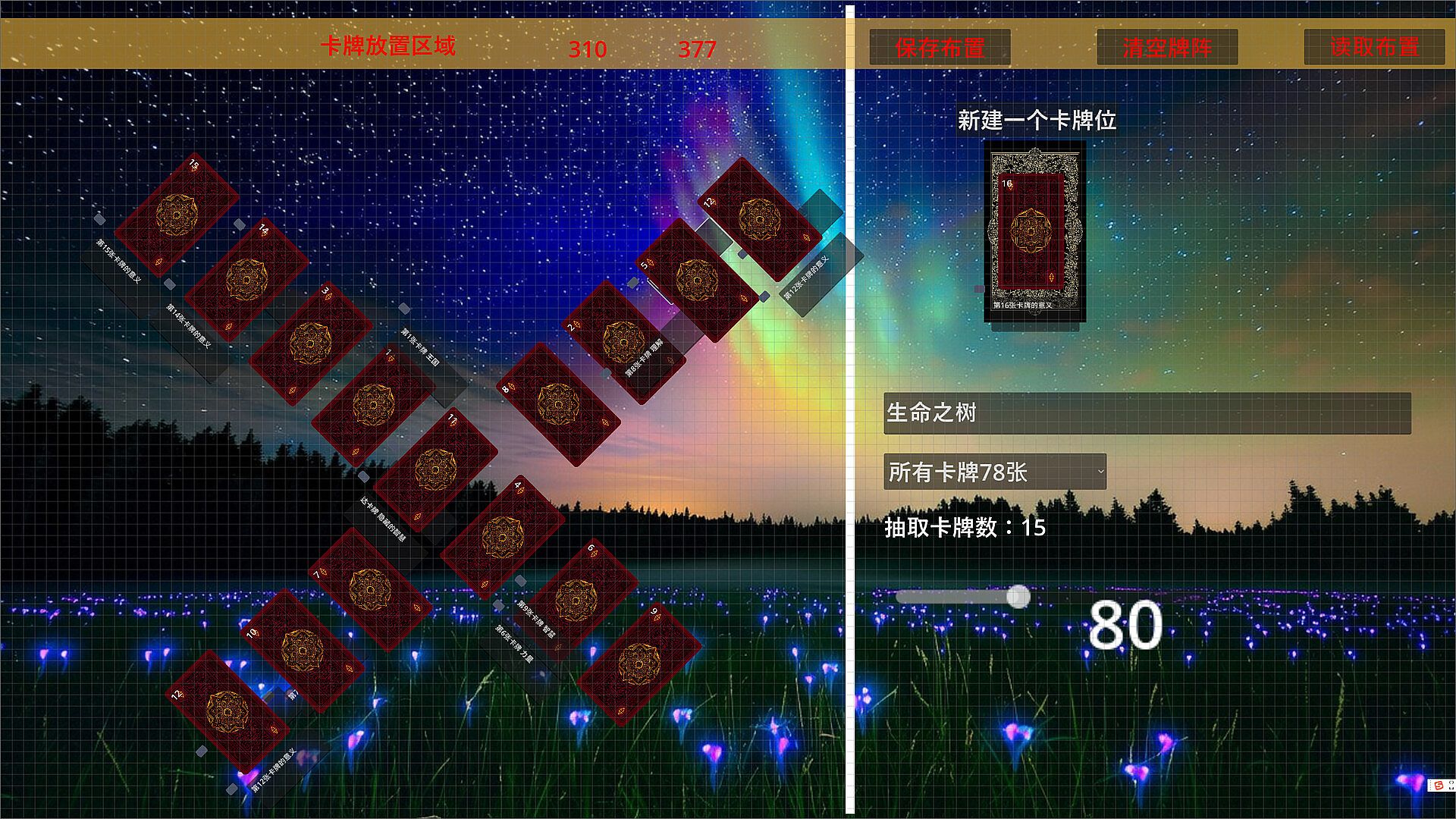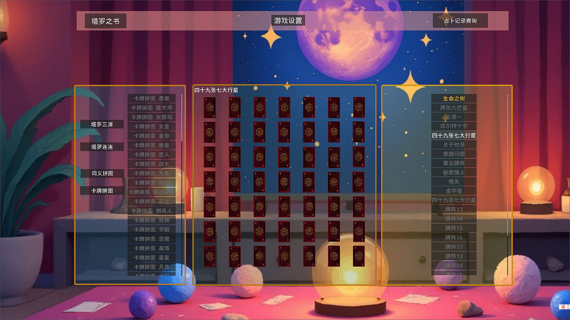 The game offers 7 different styles of Tarot decks, and also allows you to customize up to 25 different layouts (spreads).