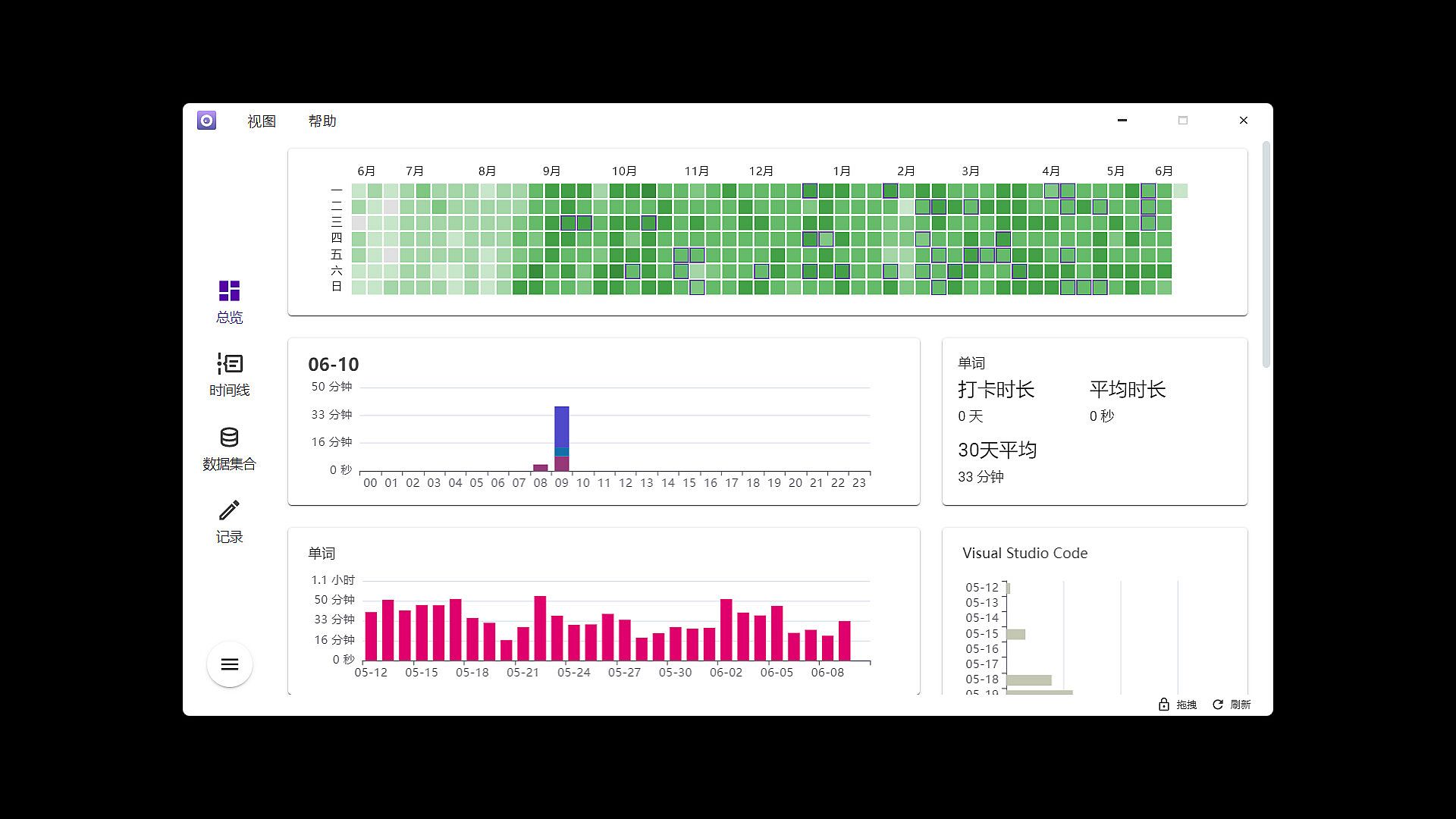 Customized data card (Github style one-year overview, 30-day single data histogram, daily 24-hour activity display)