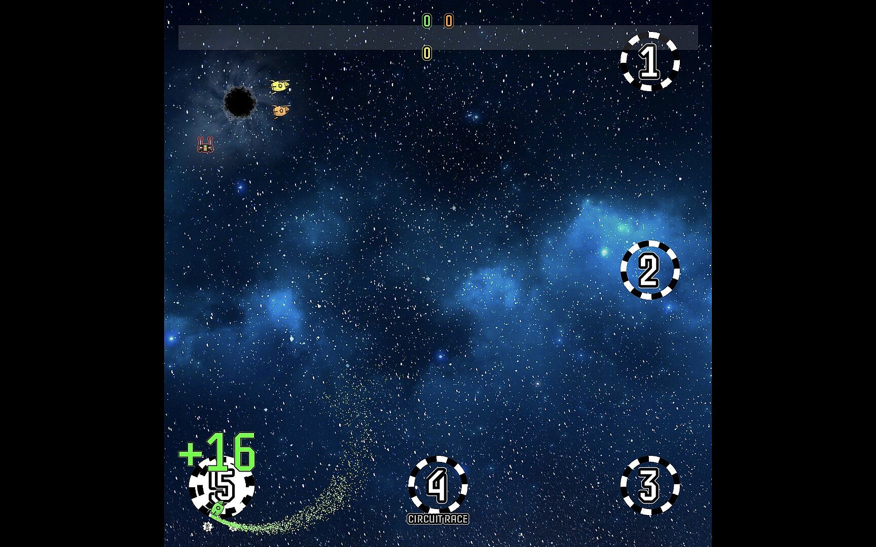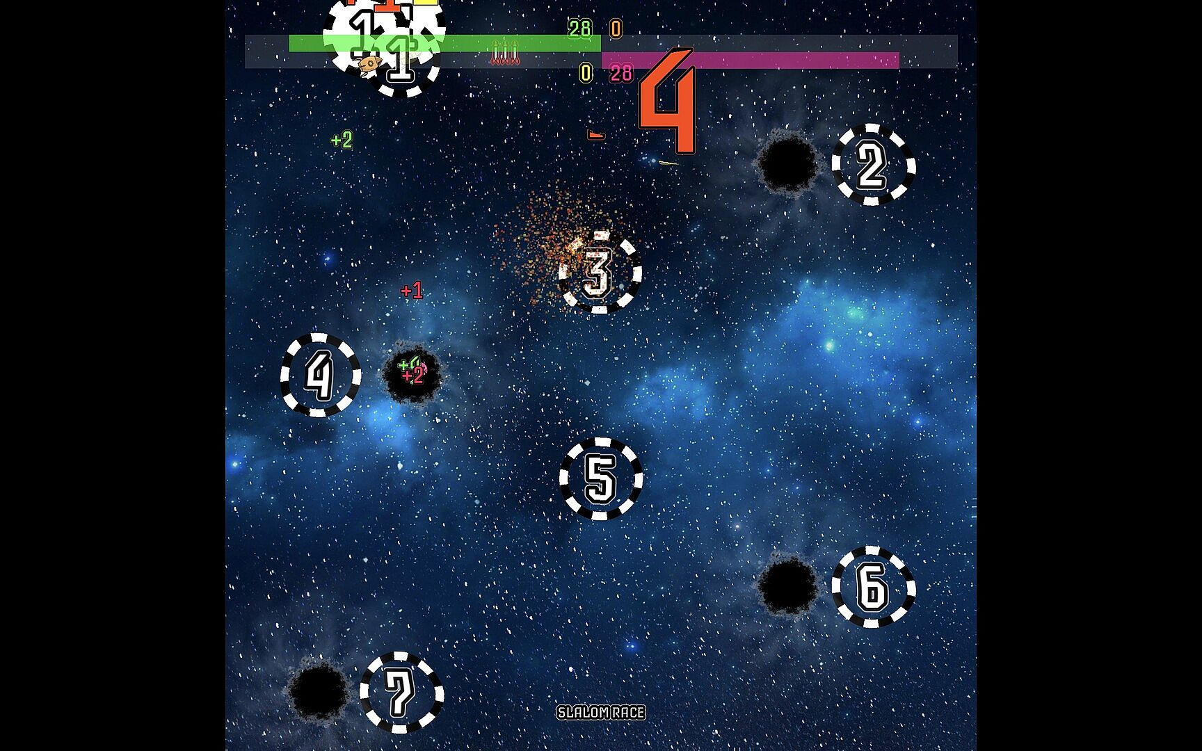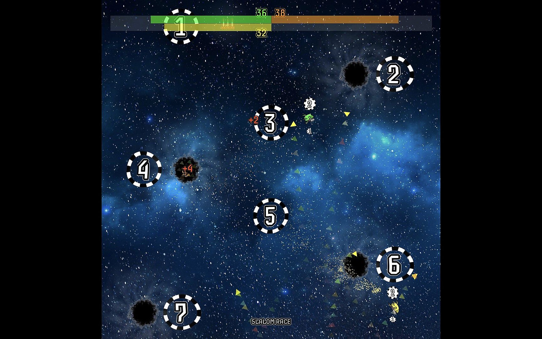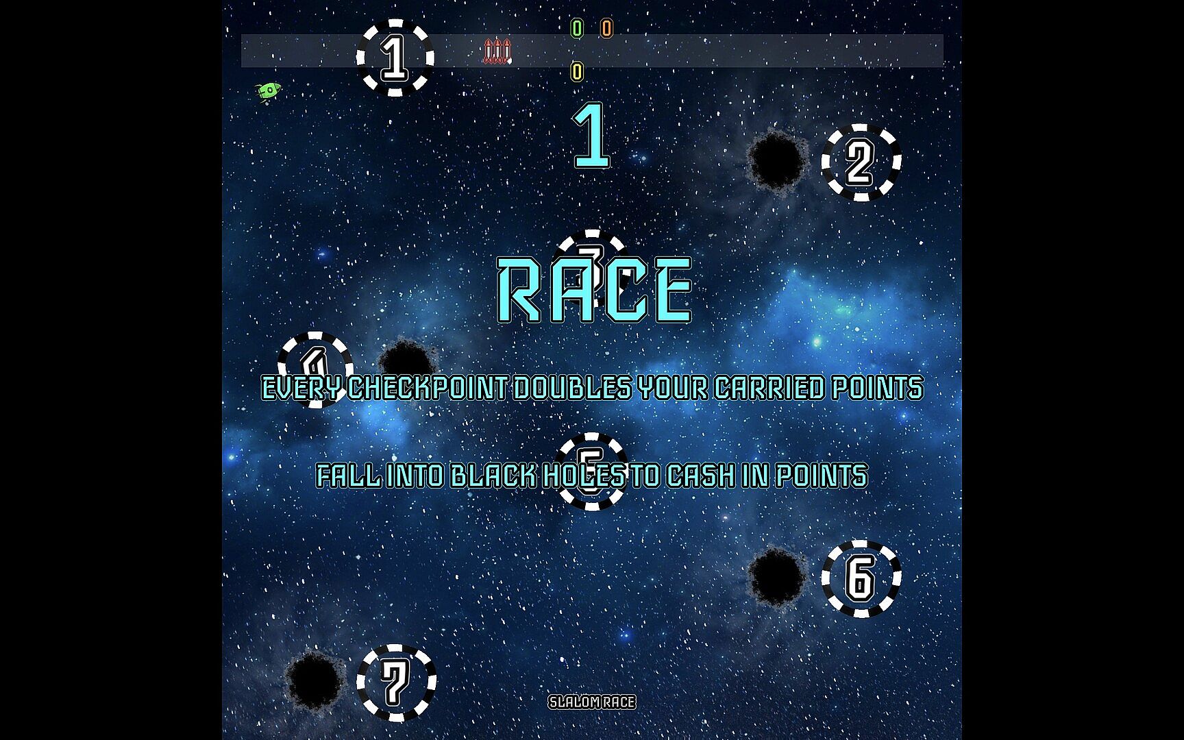 Race - Make it as far as you can through the checkpoints without getting shot, then cash in the points by diving into the black hole. Every checkpoint is worth double the last one - will you cash in early and often, or risk more checkpoints for a bigger payoff?