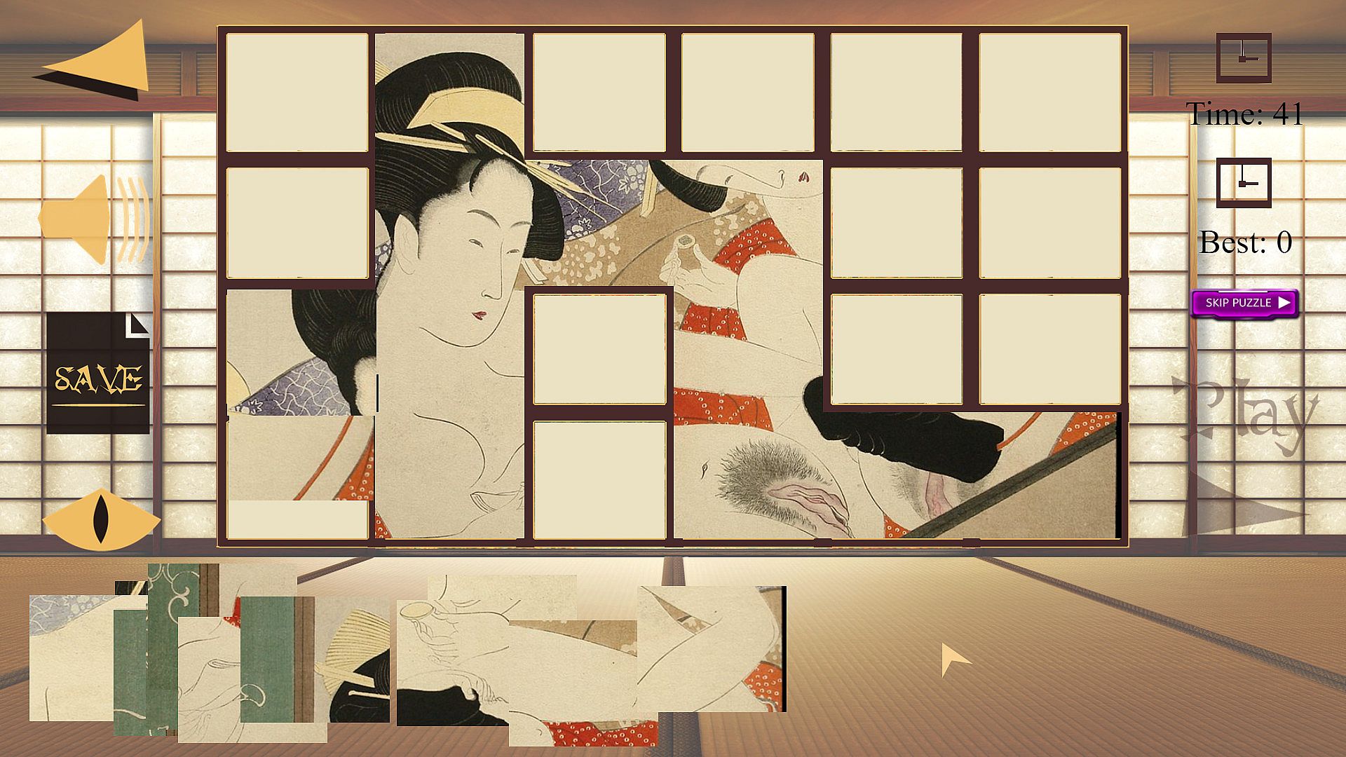 Shunga Frame is a traditional jigsaw puzzle that anyone can easily play. Amazing atmosphere, great music, high quality Shunga artworks, great for relaxing.