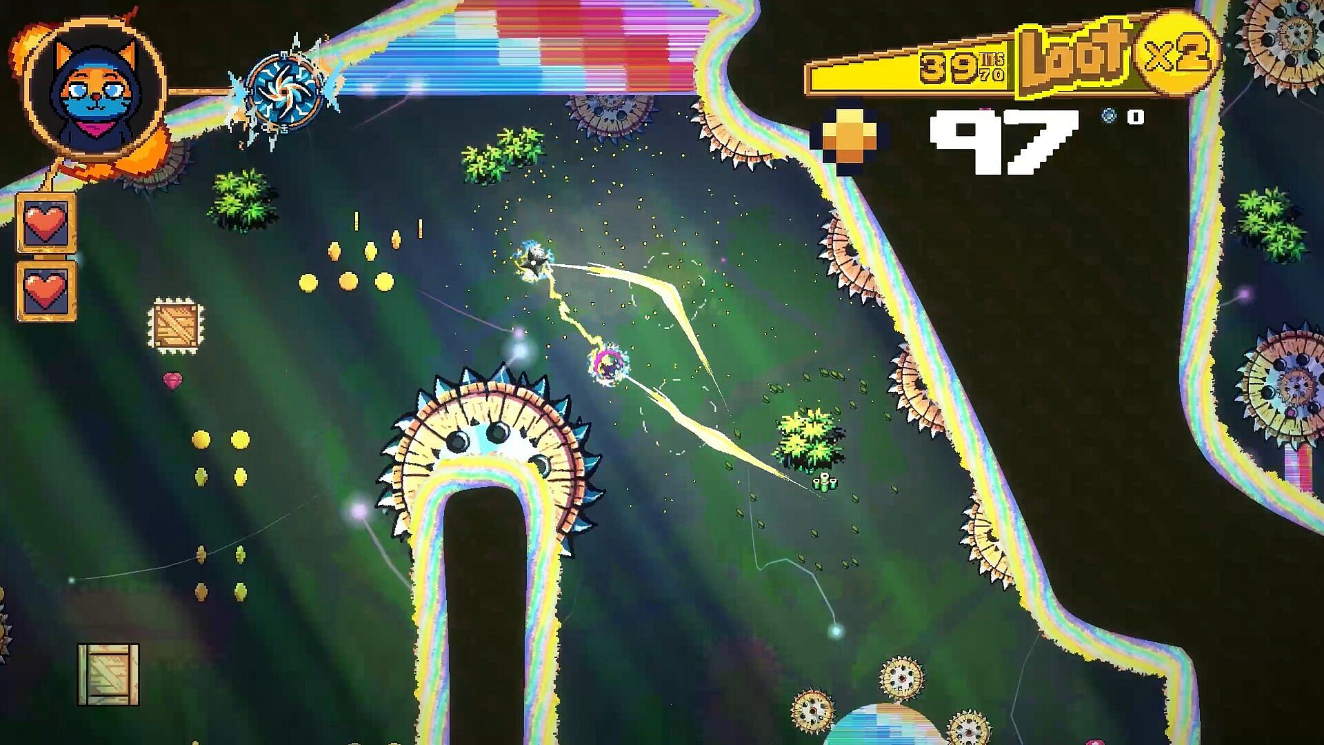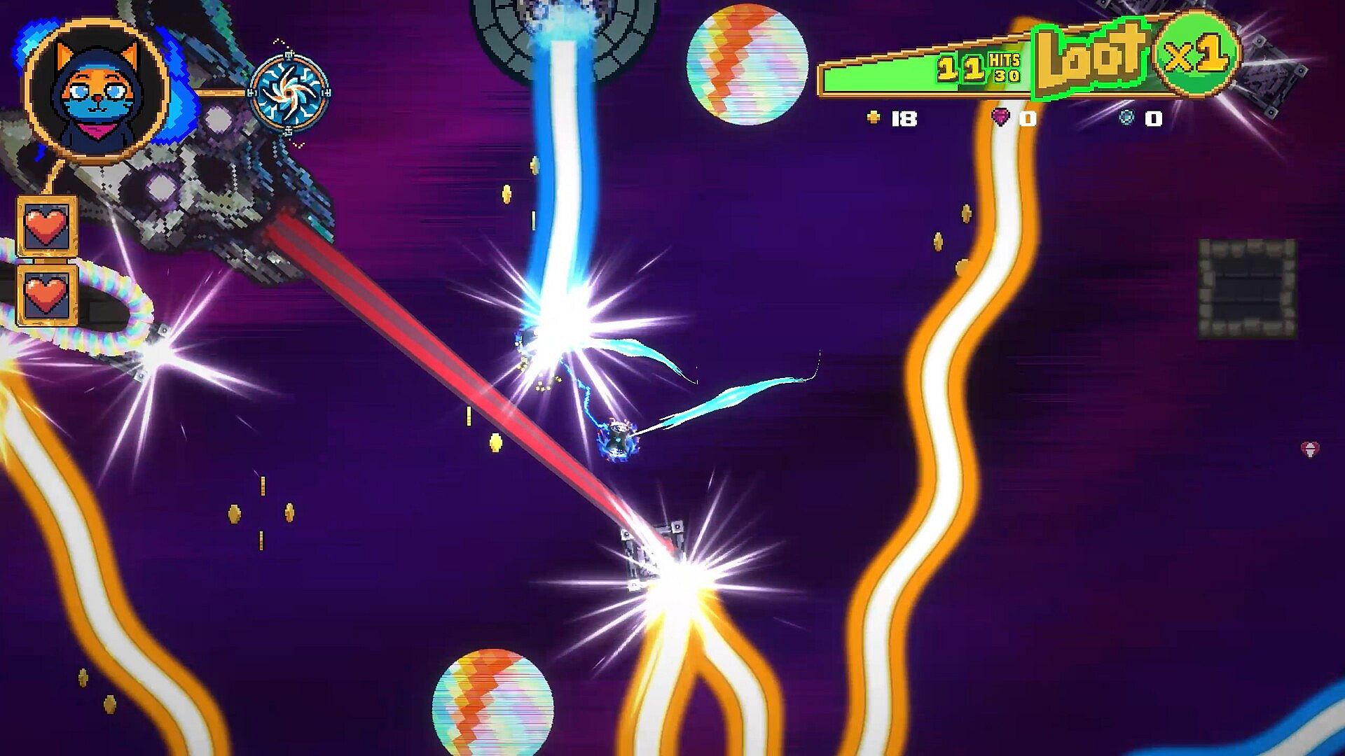 You play as Shurigatto, a ninja cat tethered to a magic shuriken, fighting through corrupted worlds to reclaim the gems and restore some kind of order.
