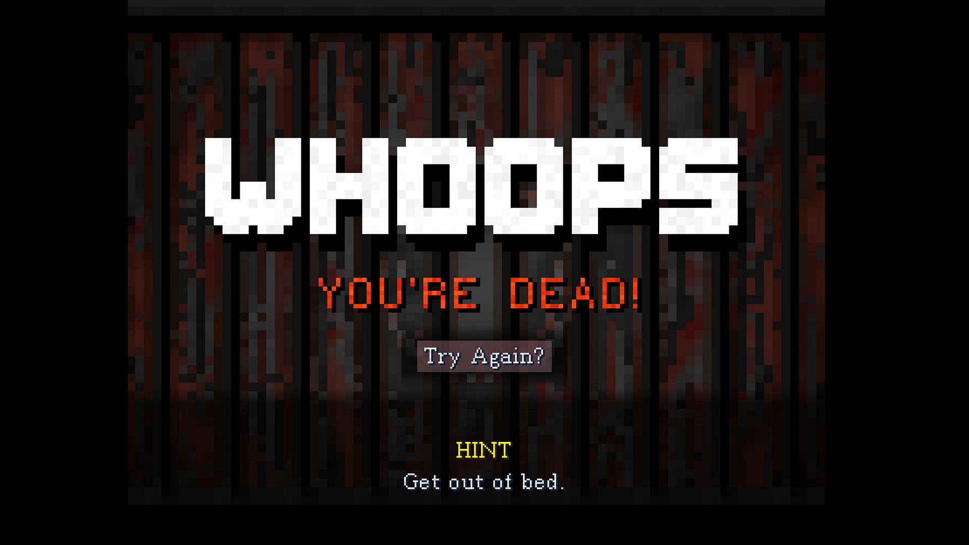But don't worry. When you (inevitably) die - because you fell down the stairs, were too stupid to operate an oven properly, got ripped apart by untold invisible horror, something like that - you can always just give up. Try again tomorrow. Or the next day. Or the next day.