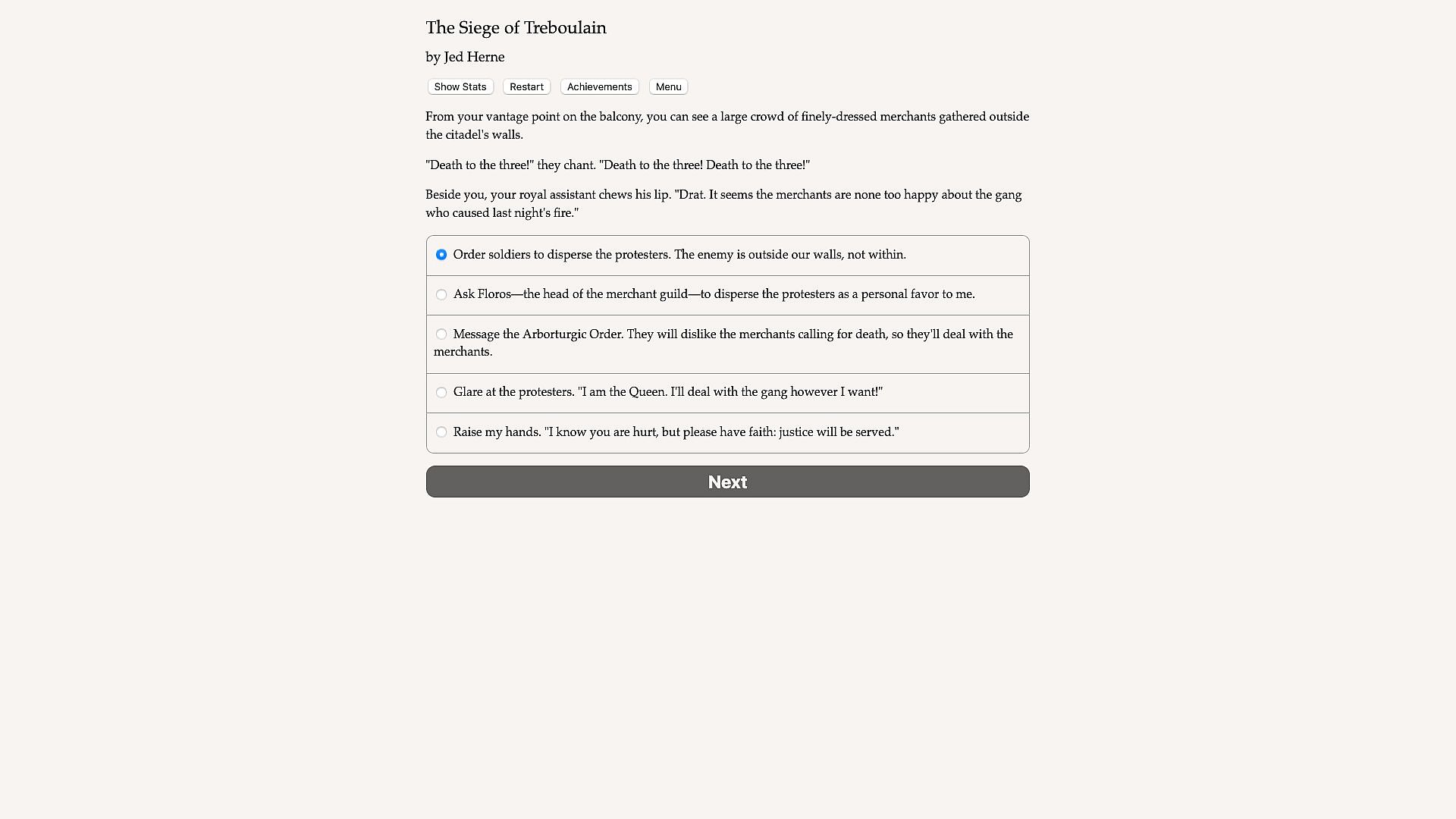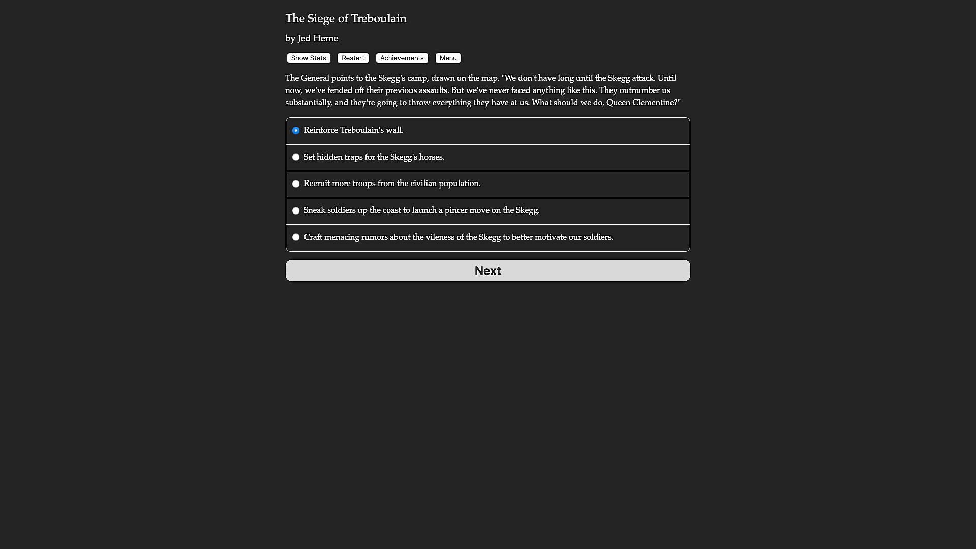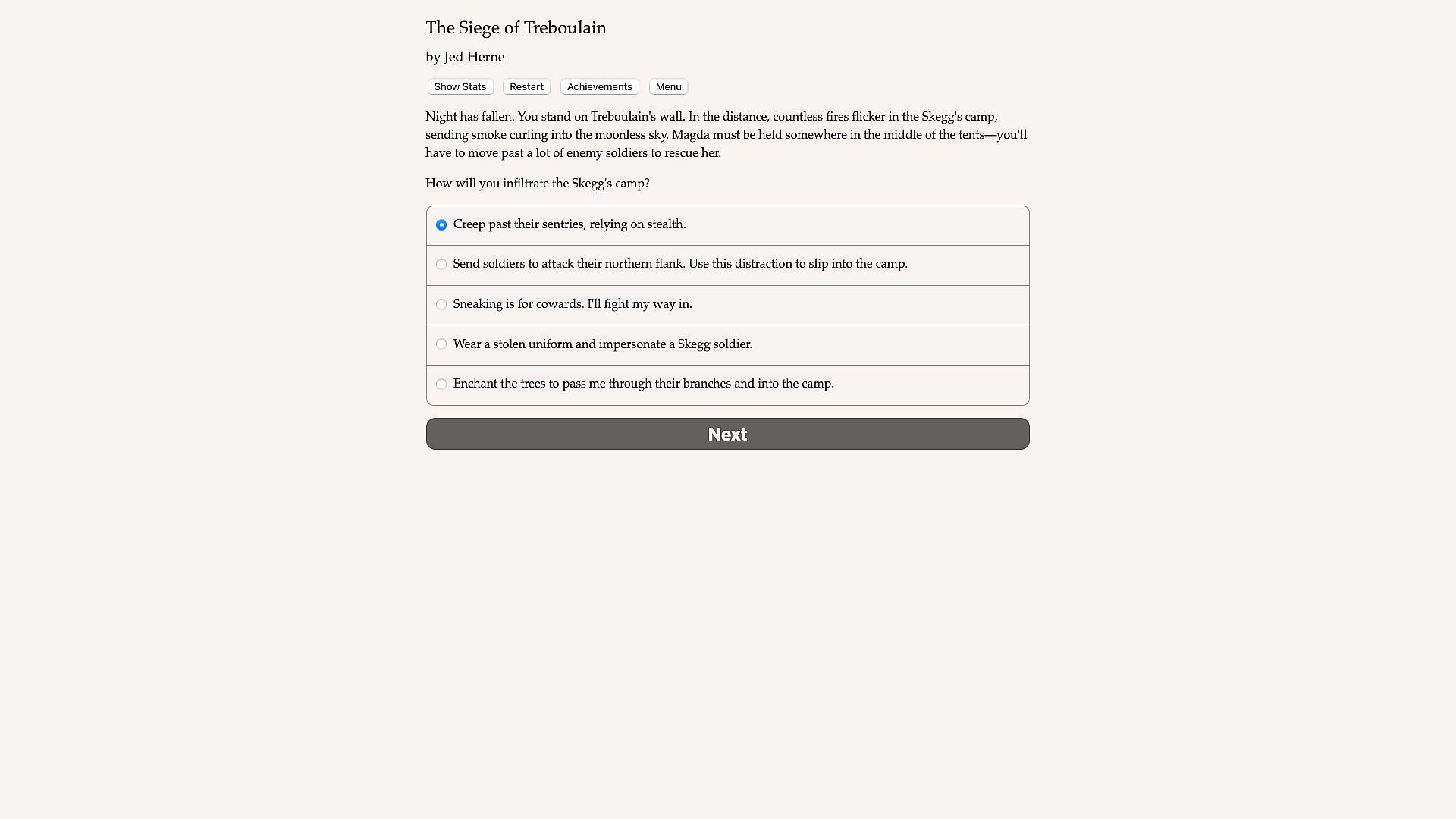 The Siege of Treboulain is a 260,000-word interactive novel by Jed Herne. It’s entirely text-based, without graphics or sound effects, and fueled by the vast, unstoppable power of your imagination.