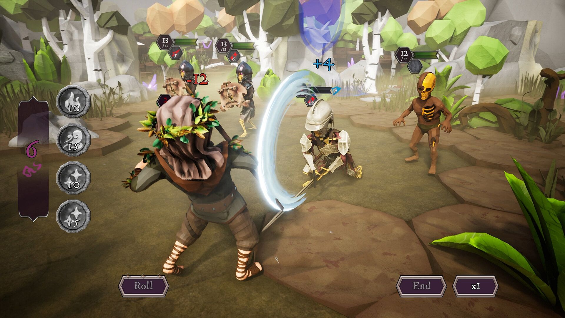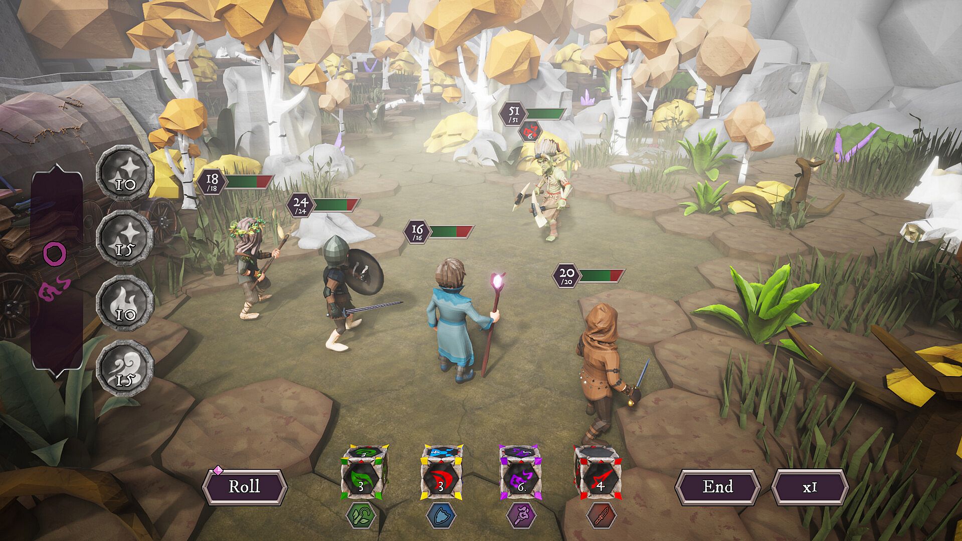 Manage up to four characters in your team, creating unique builds and synergies tailored to your playstyle. The dice are crucial during the whole playthrough and represent abilities of the party.