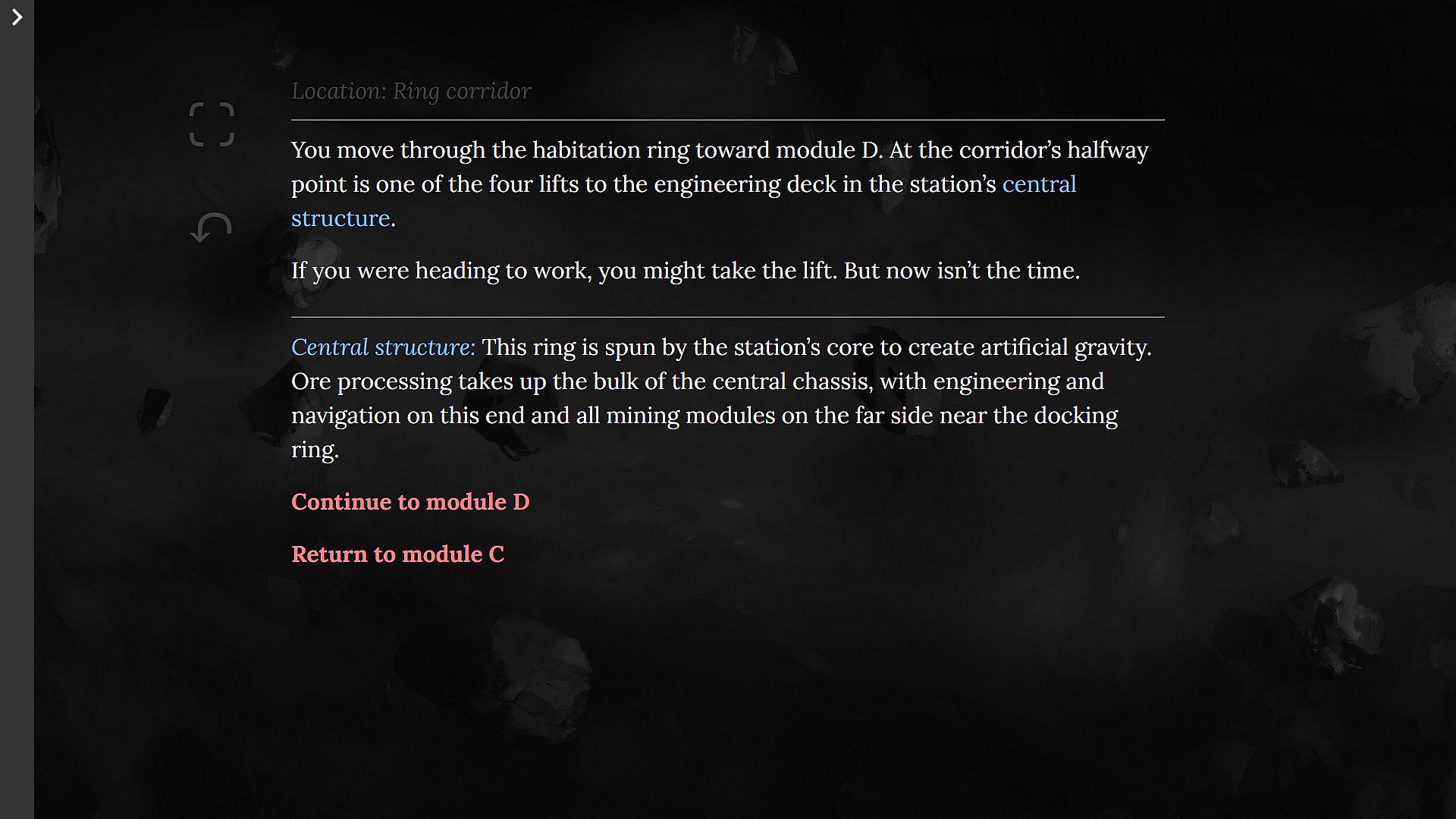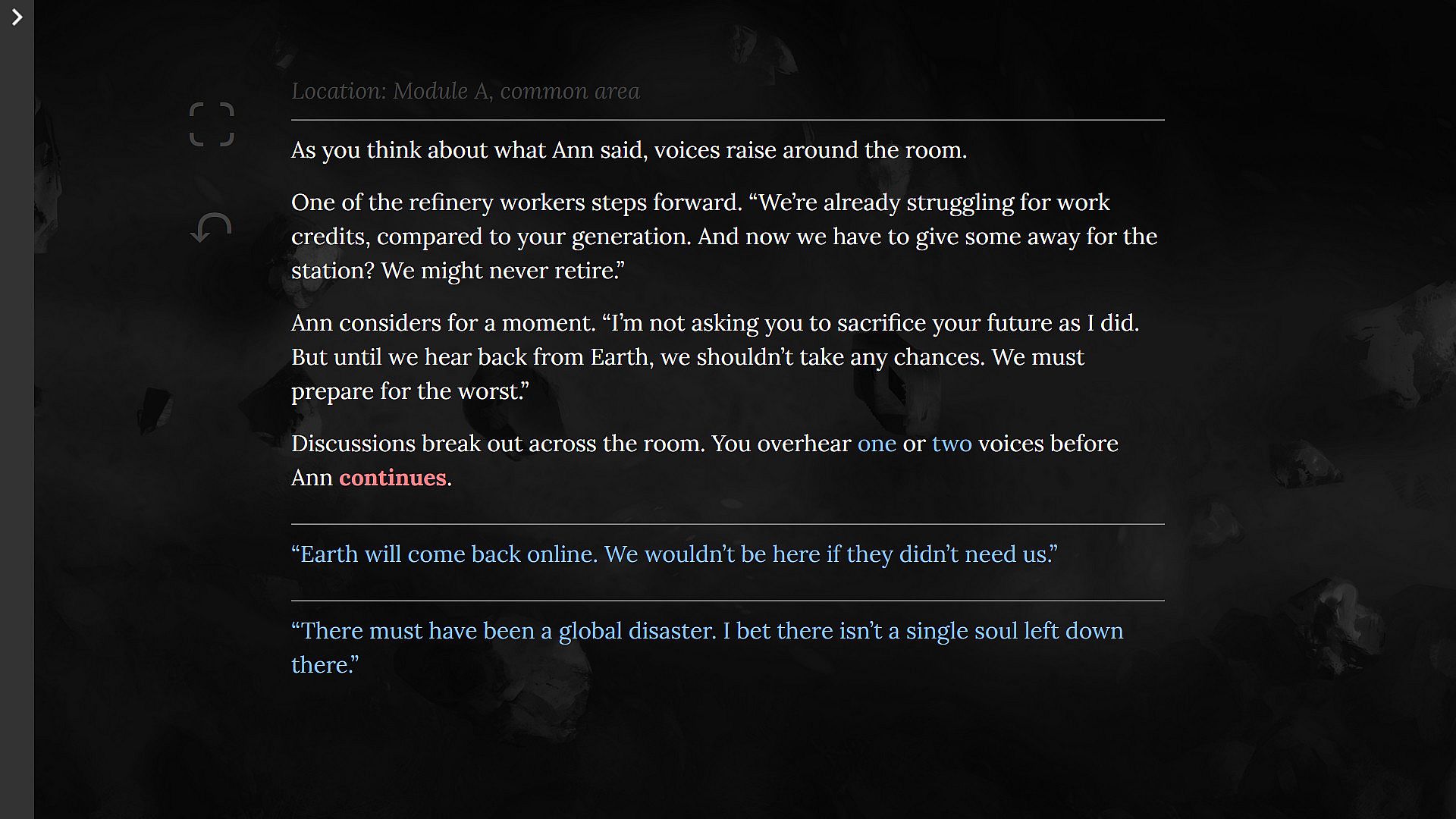 Bean II struggle to find meaning after Earth stops responding to communications, putting their lifelong purpose into question. Players explore the off-world mining colony ship, navigate multi-linear character relationships, and steer the story toward one of five endings.
