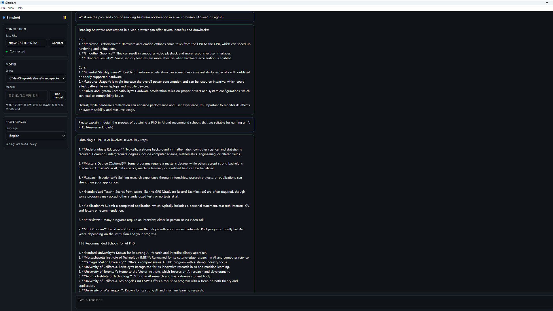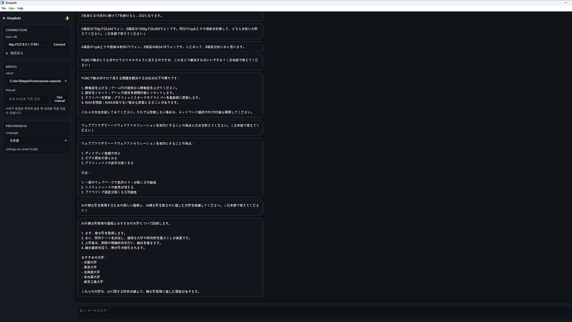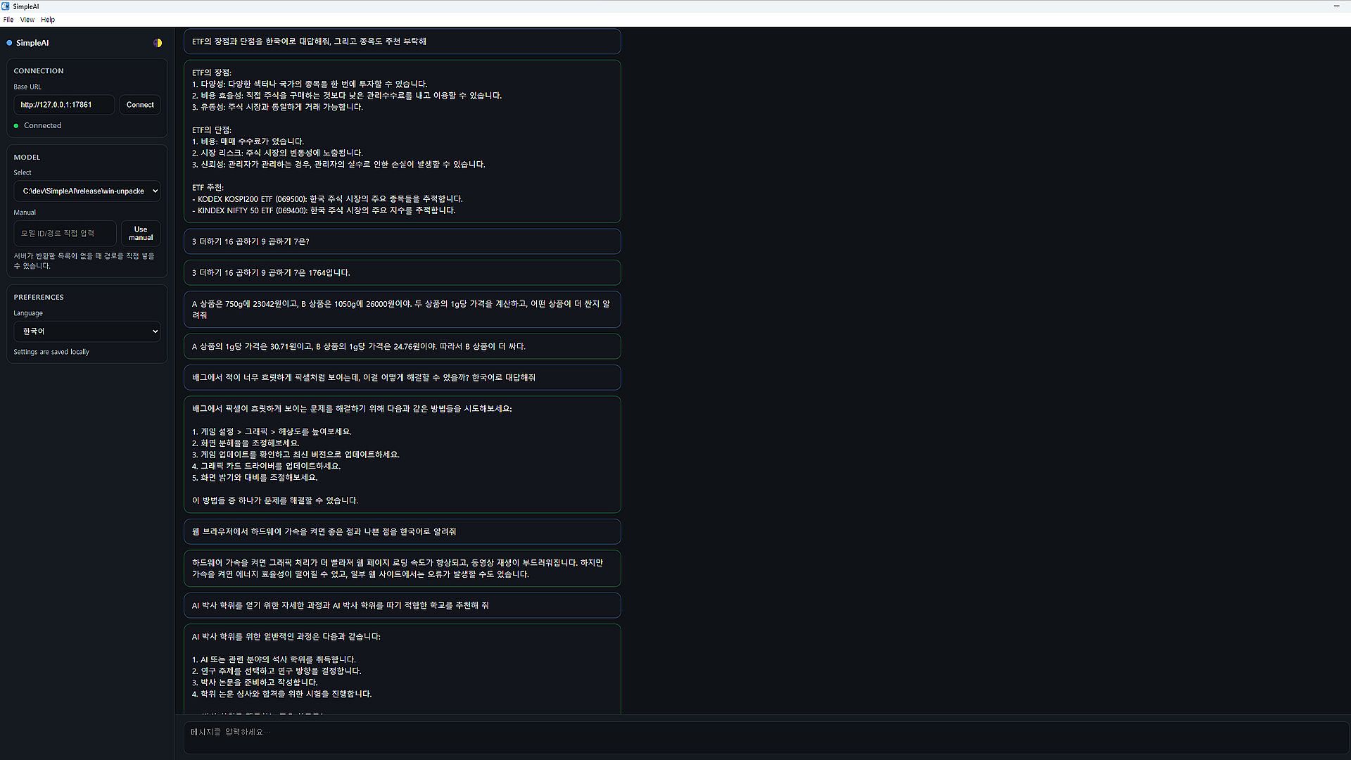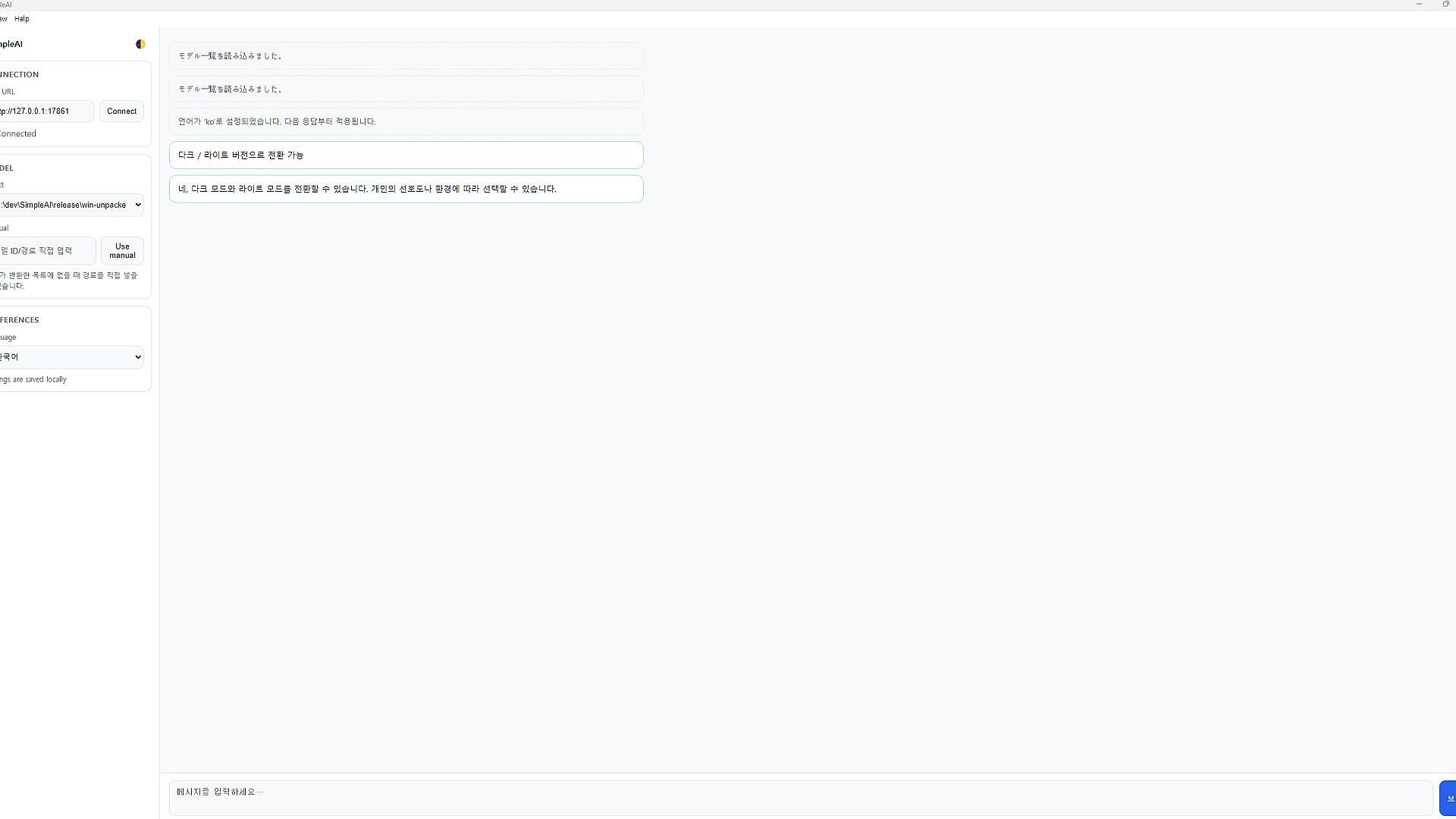 SimpleAI is a lightweight desktop AI tool that runs directly on your PC. It provides text conversations, writing assistance, brainstorming, and coding support — all without requiring an internet connection.