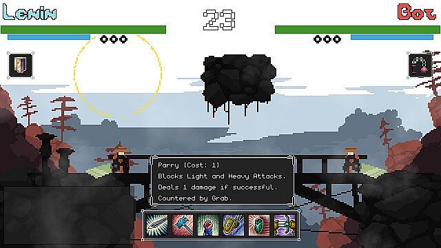 You have 30 seconds per turn. Both you and your opponent select your moves simultaneously. The moves are setup in a rock-paper-scissors fashion. Offensive moves counter neutral moves, neutral moves counter defensive moves, and defensive moves counter offensive moves. If you do not pick a move within the 30 seconds you will automatically Wait! Your health and energy are determined by your chosen weapon. Moves have an associated energy cost and you can only use moves that you have the energy for. If your health reaches 0 you lose, even if you kill your opponent on the same turn. Some moves can stun you. This is indicated by the orange icon below your health bar. When you are stunned you will not be able to select a move that turn. Each weapon has a unique combo that can be read in the weapon's tooltip. Using the three moves of the combo in order will deal an additional 2 damage to your opponent. The gold orbs below your health bar keep track of your combo progress.