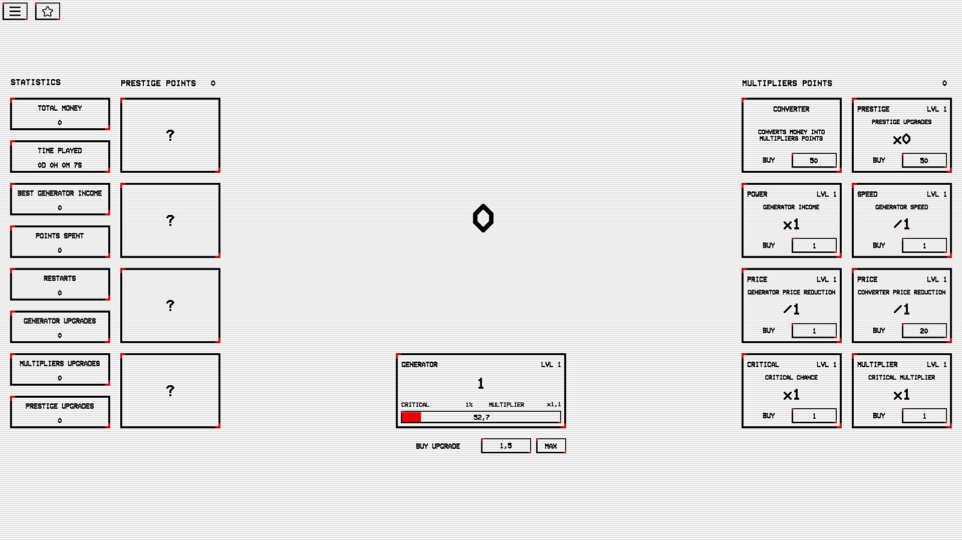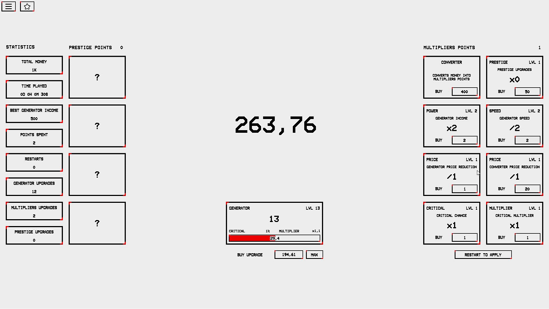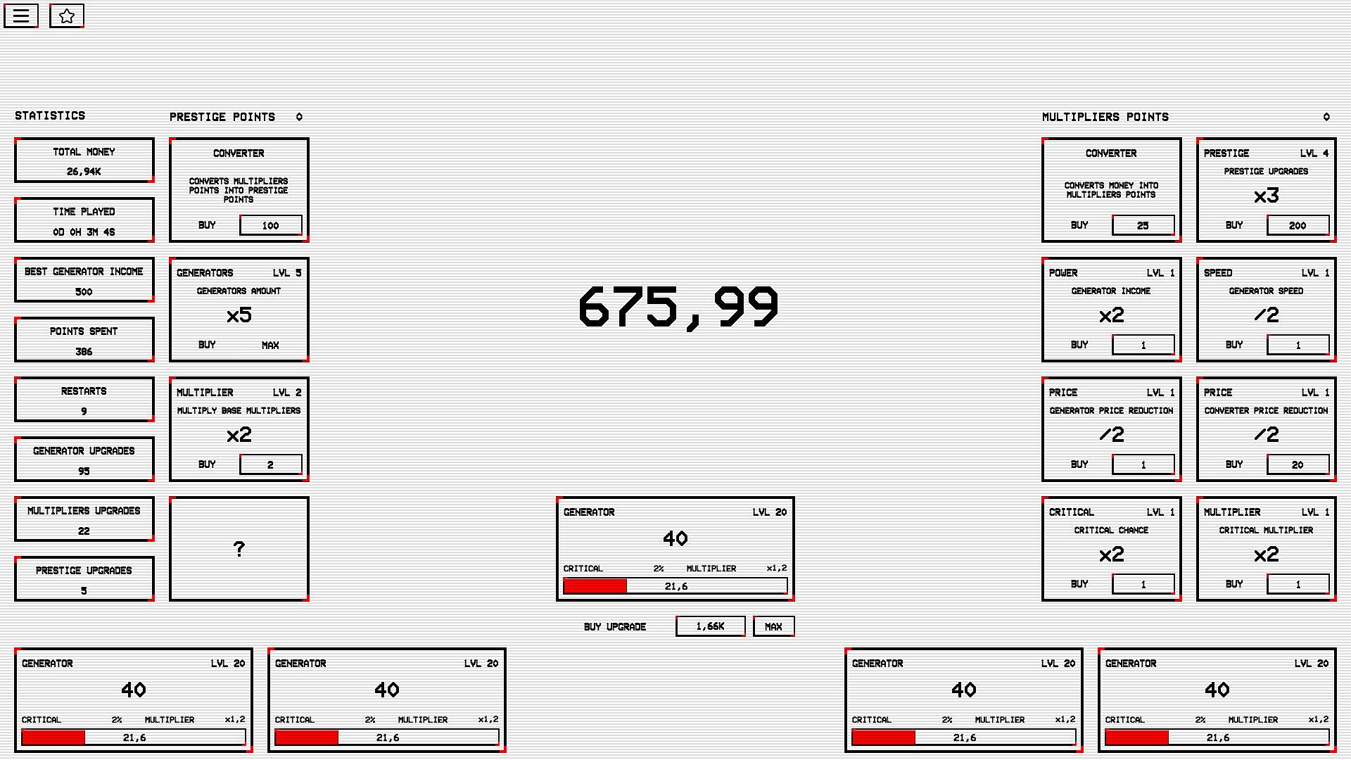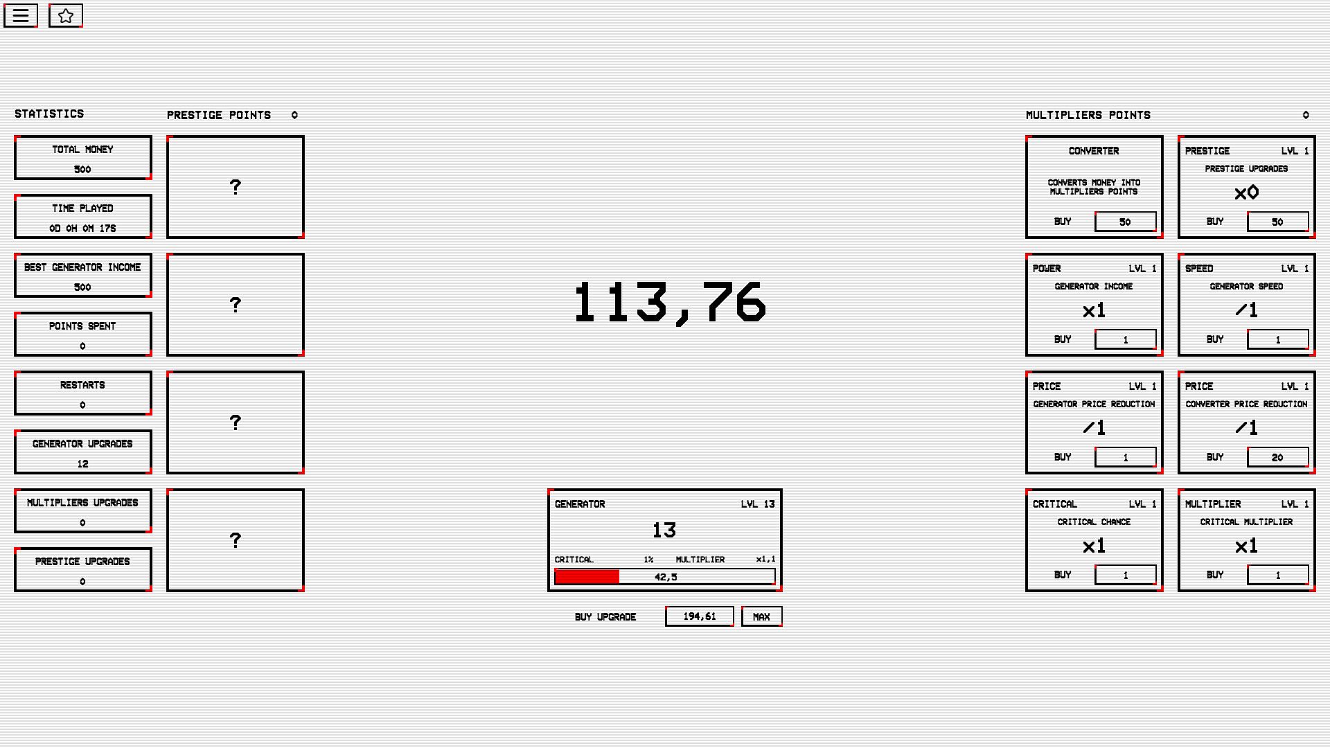 You start with only one generator which produces passive income. Use a profit it makes to improve its power and buy multiplier points. Spend them for powerful upgrades which significantly boost your generator. Or use them to unlock even more powerful prestige upgrades. Multiply multipliers, unlock new generators, complete the game! It's up to you what to do!