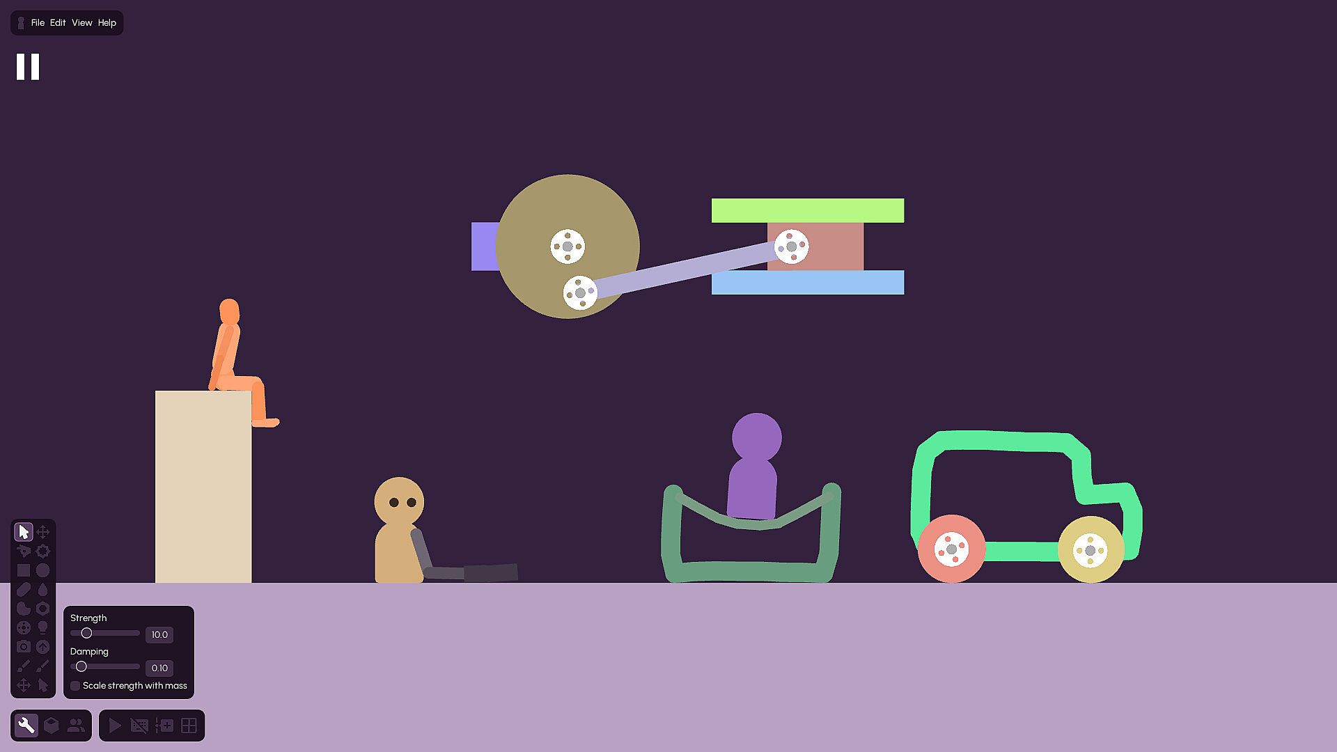 Simulo is a 2D physics sandbox game where you can do Anything*. Users can use a variety of in-game tools to build Whatever they could possibly imagine, from simple contraptions to simple contraptions. Or, you can just use it to mess around with ragdolls.