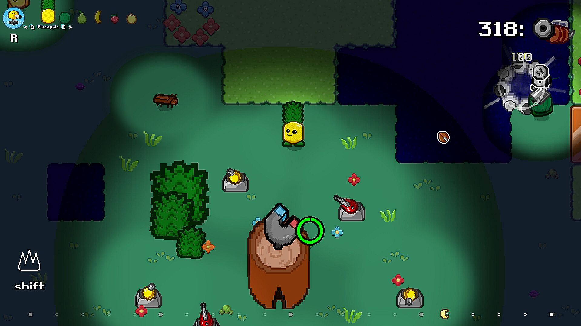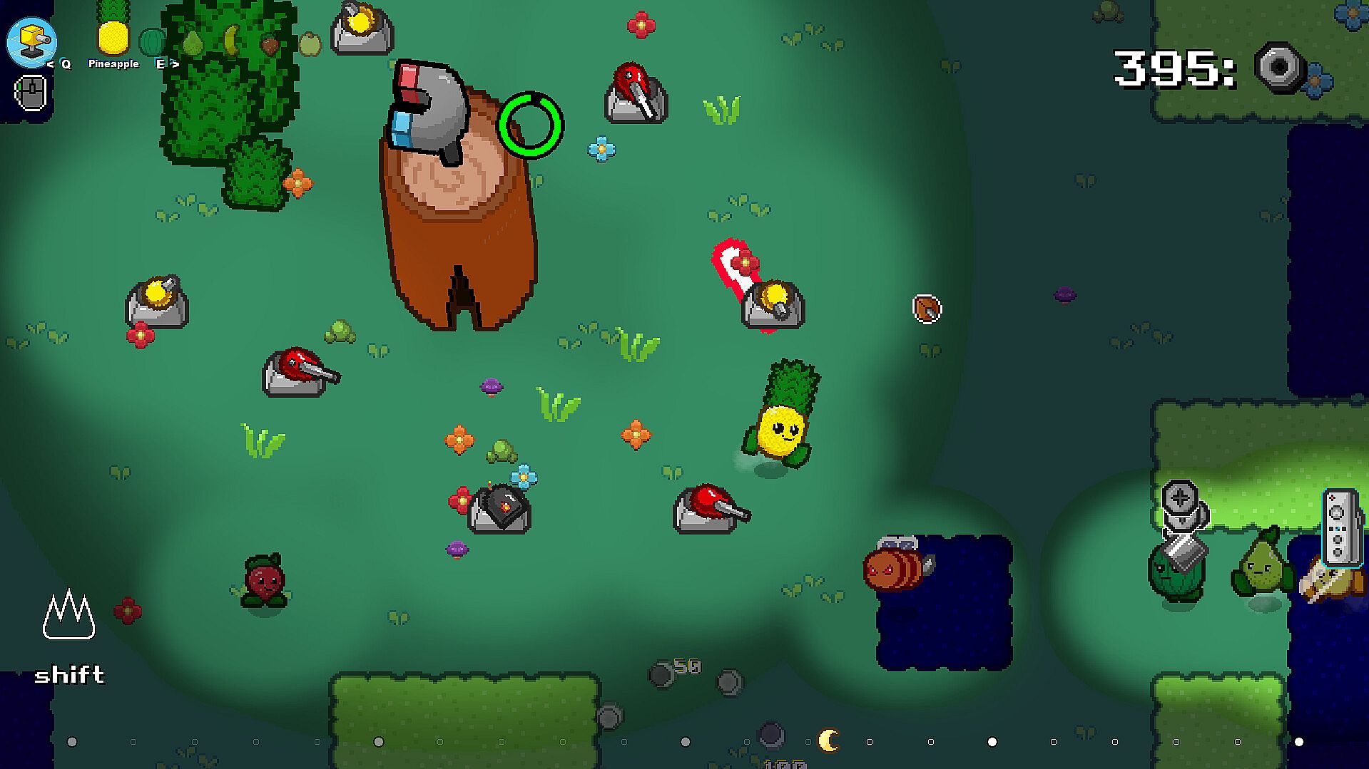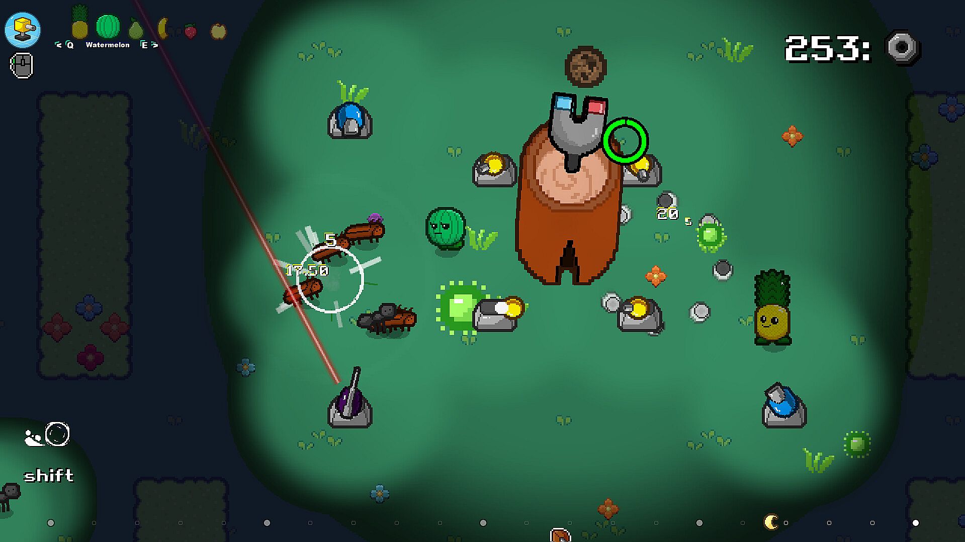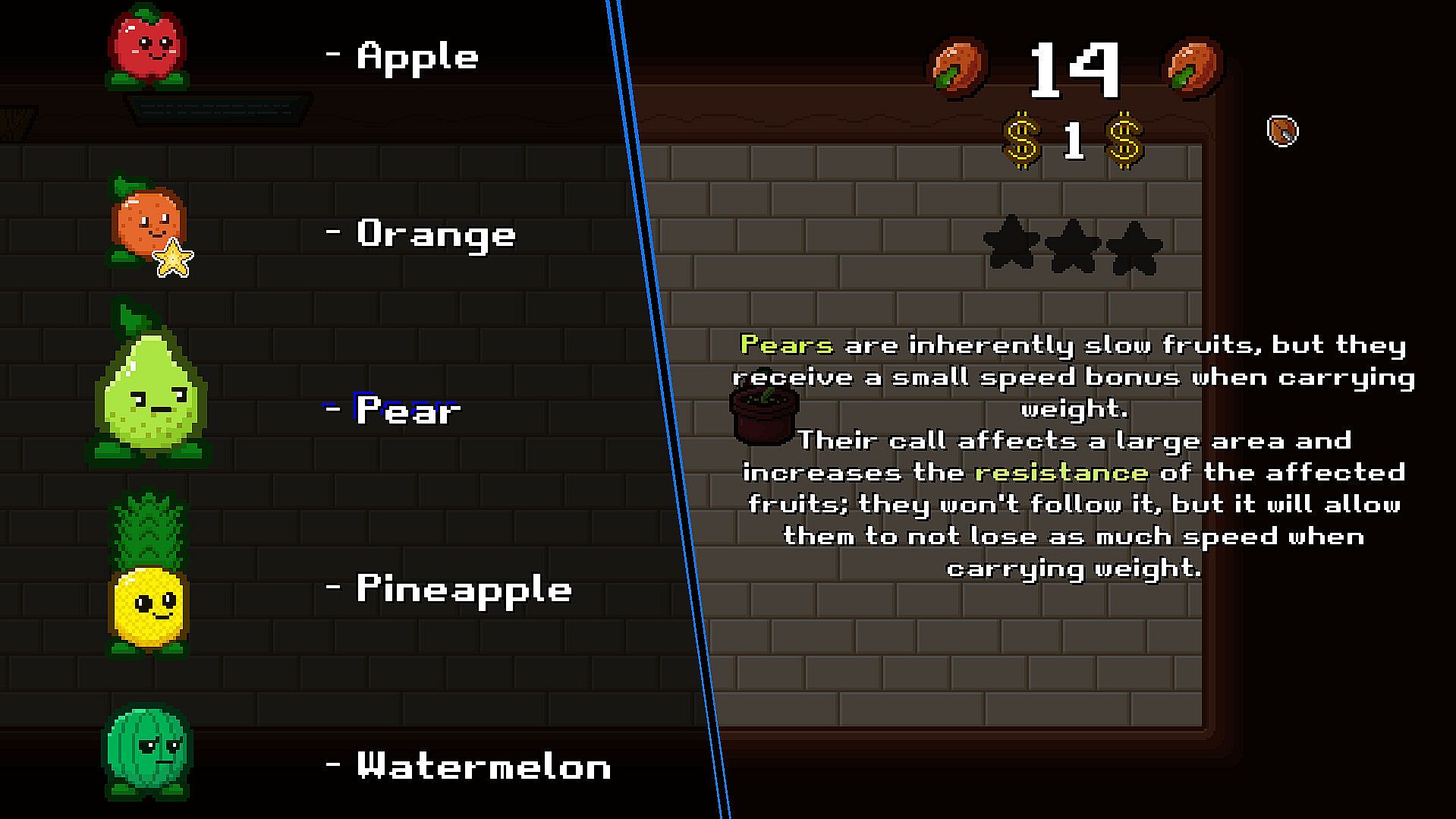 Lead a army of fruits, each one with their own set of unique skills. Some being faster, other being able to carry more resources, and other ones with special skills like being able to increase the speed of other fruits.