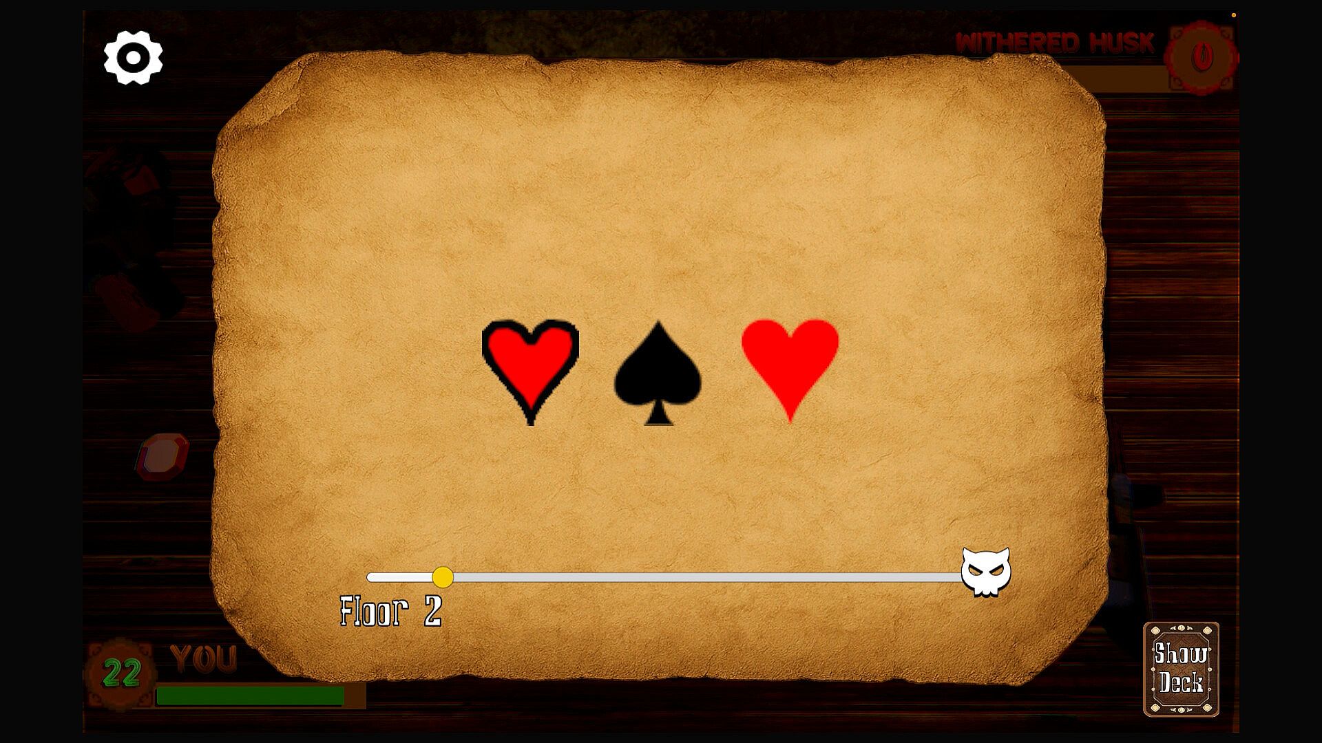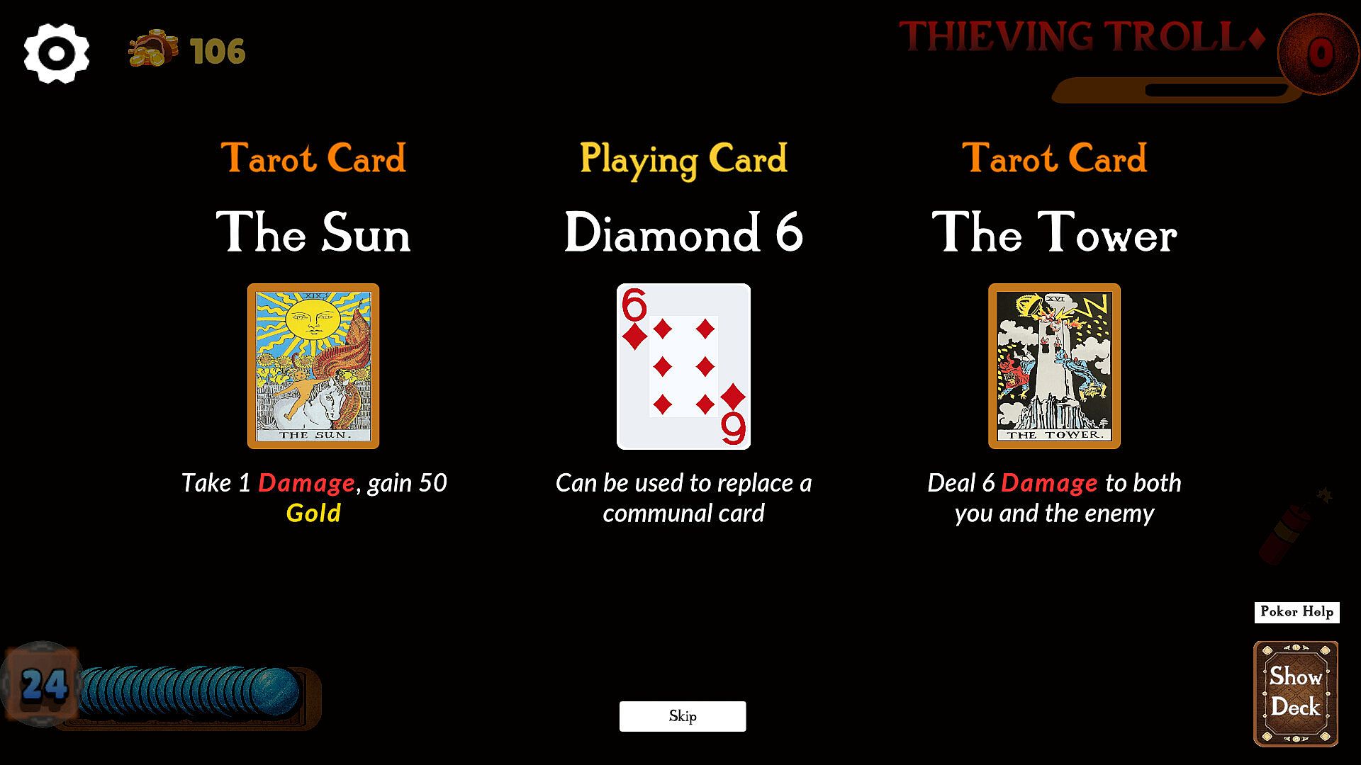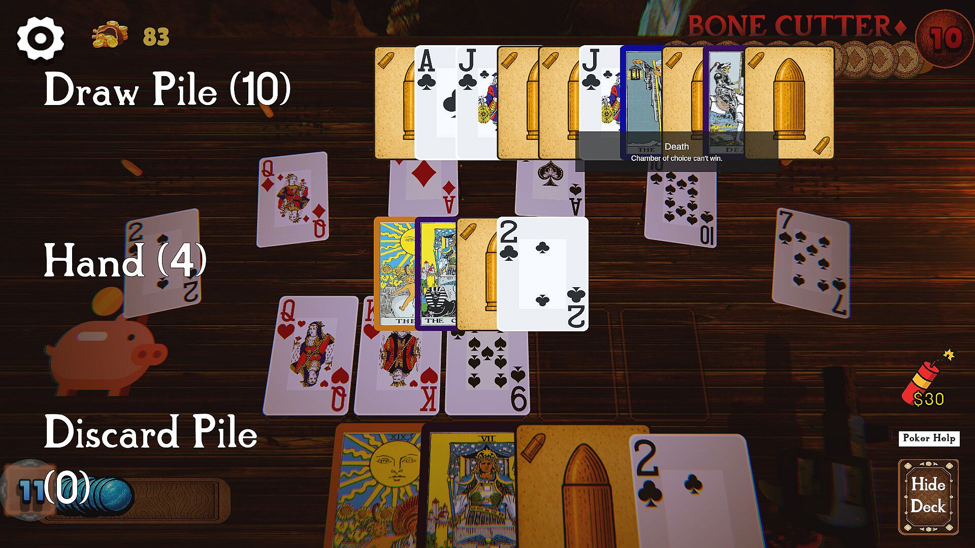 Six Chambers is a poker-inspired roguelike deckbuilder where every battle is decided by the hand you choose to play. Using traditional Texas Hold’em rules, you speculate between six possible hands—each showing only one face-up card—and weigh the risk of how much damage a losing hand could cost you.