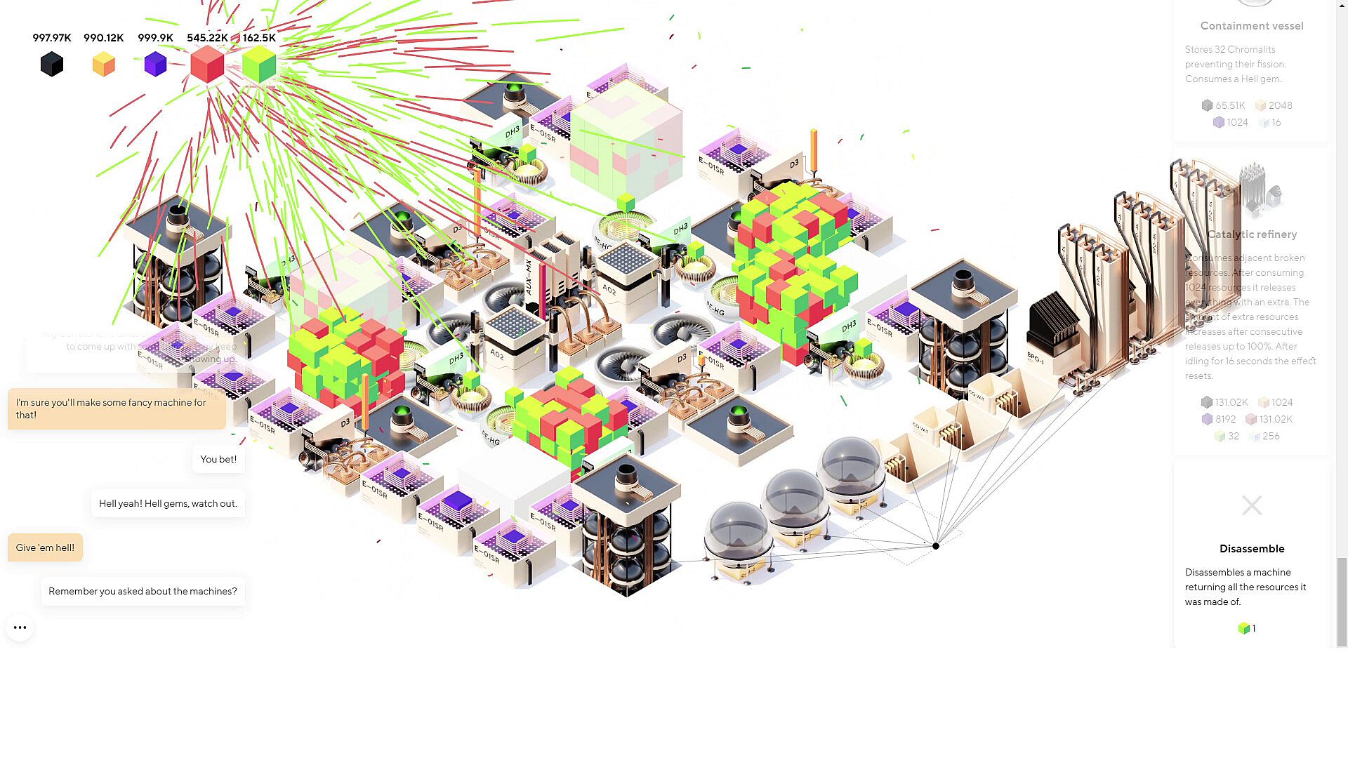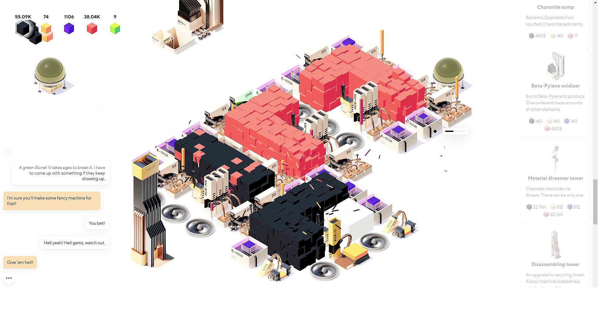 Begin your journey with a simple machine generating distinct cubes. Use combinations of cubes to unlock advanced machinery and new gameplay elements.