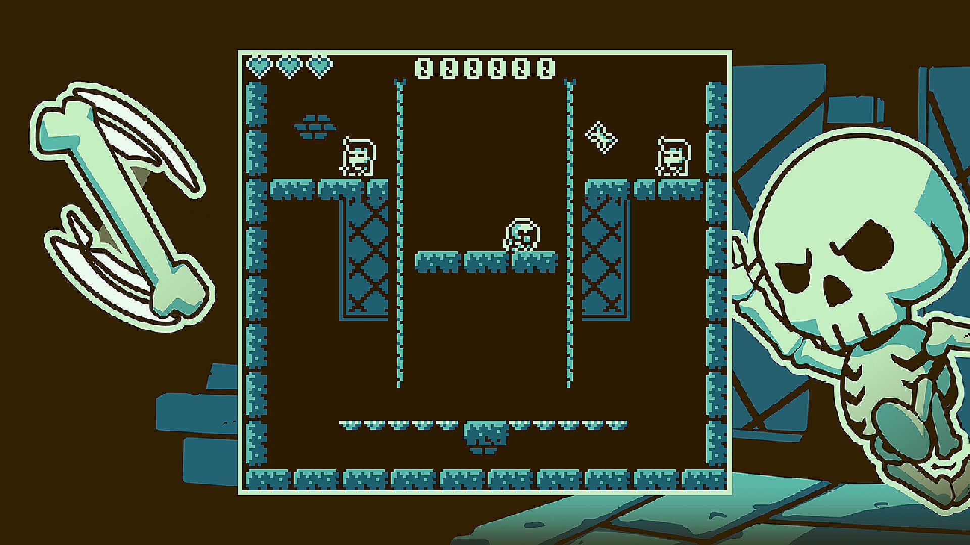 Skelly's Skirmish is a simple but challenging single-screen arcade platformer in the visual style of a DMG Game Boy game.