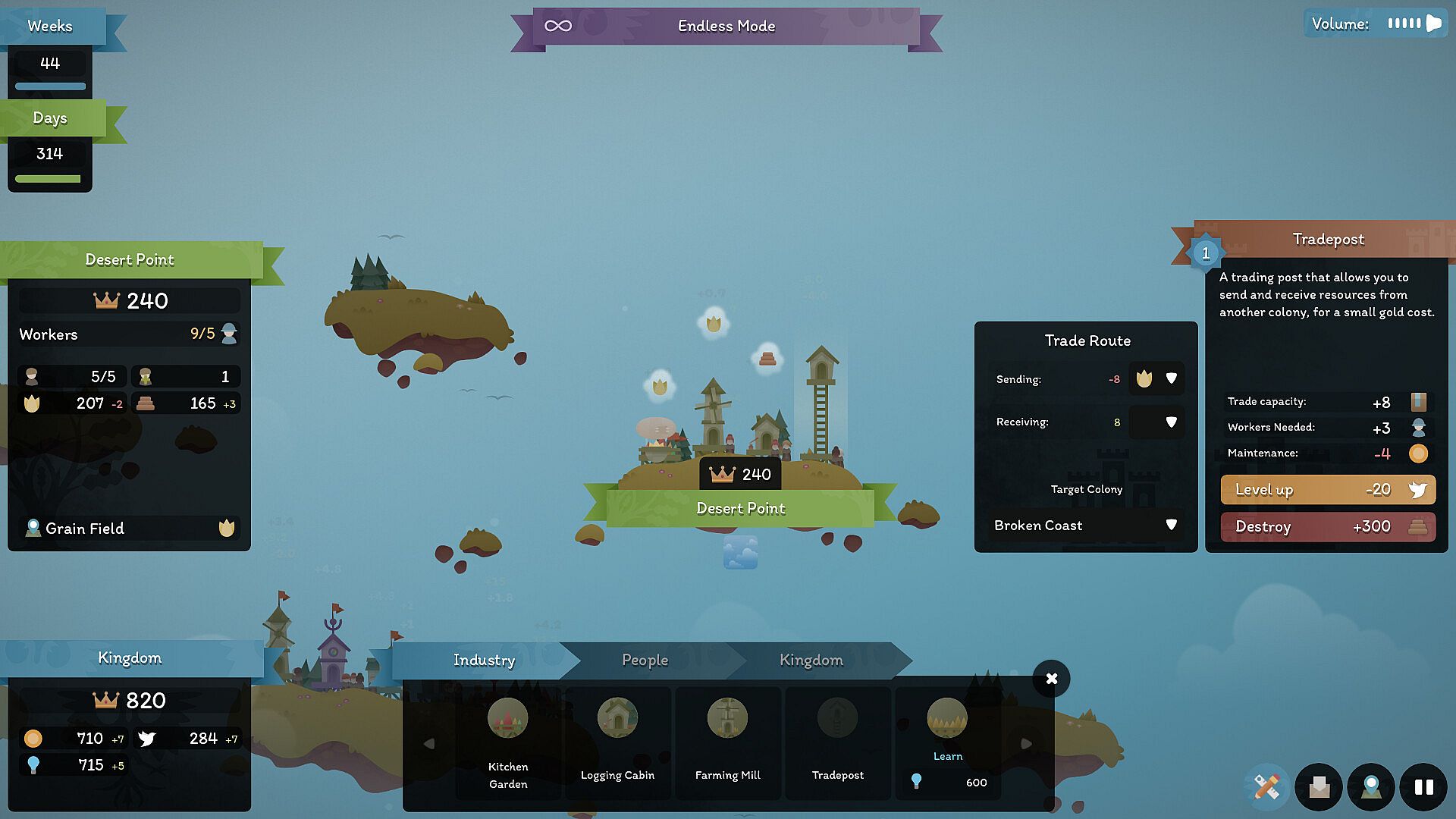 Expand to new islands, connect them with trade, and take advantage of unique bonuses hidden within the land. From humble beginnings, you will raise a kingdom that defies gravity itself.