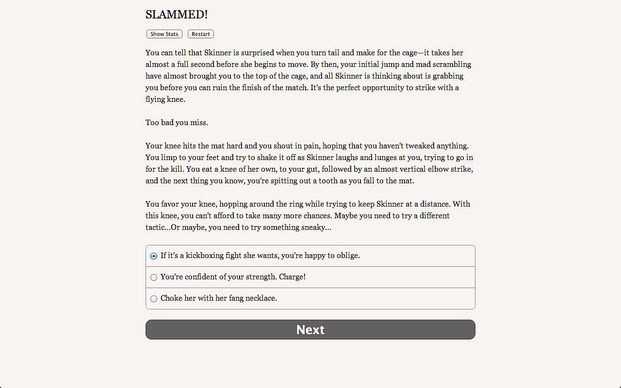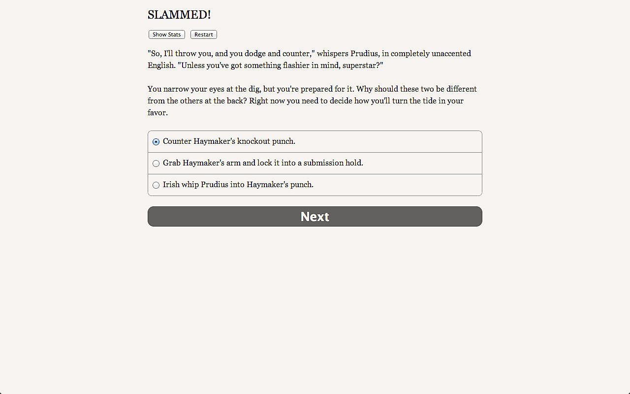 Slammed! is an epic interactive professional-wrestling novel by Paolo Chikiamco, where your choices control the story. The game is entirely text-based--without graphics or sound effects--and fueled by the vast, unstoppable power of your imagination.