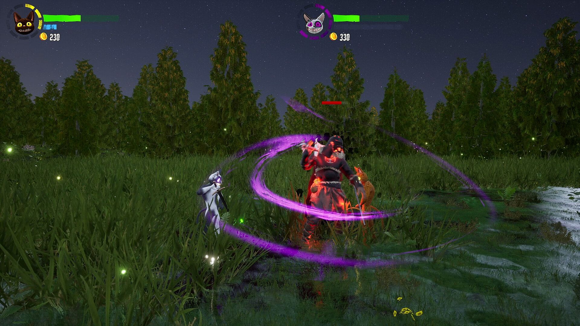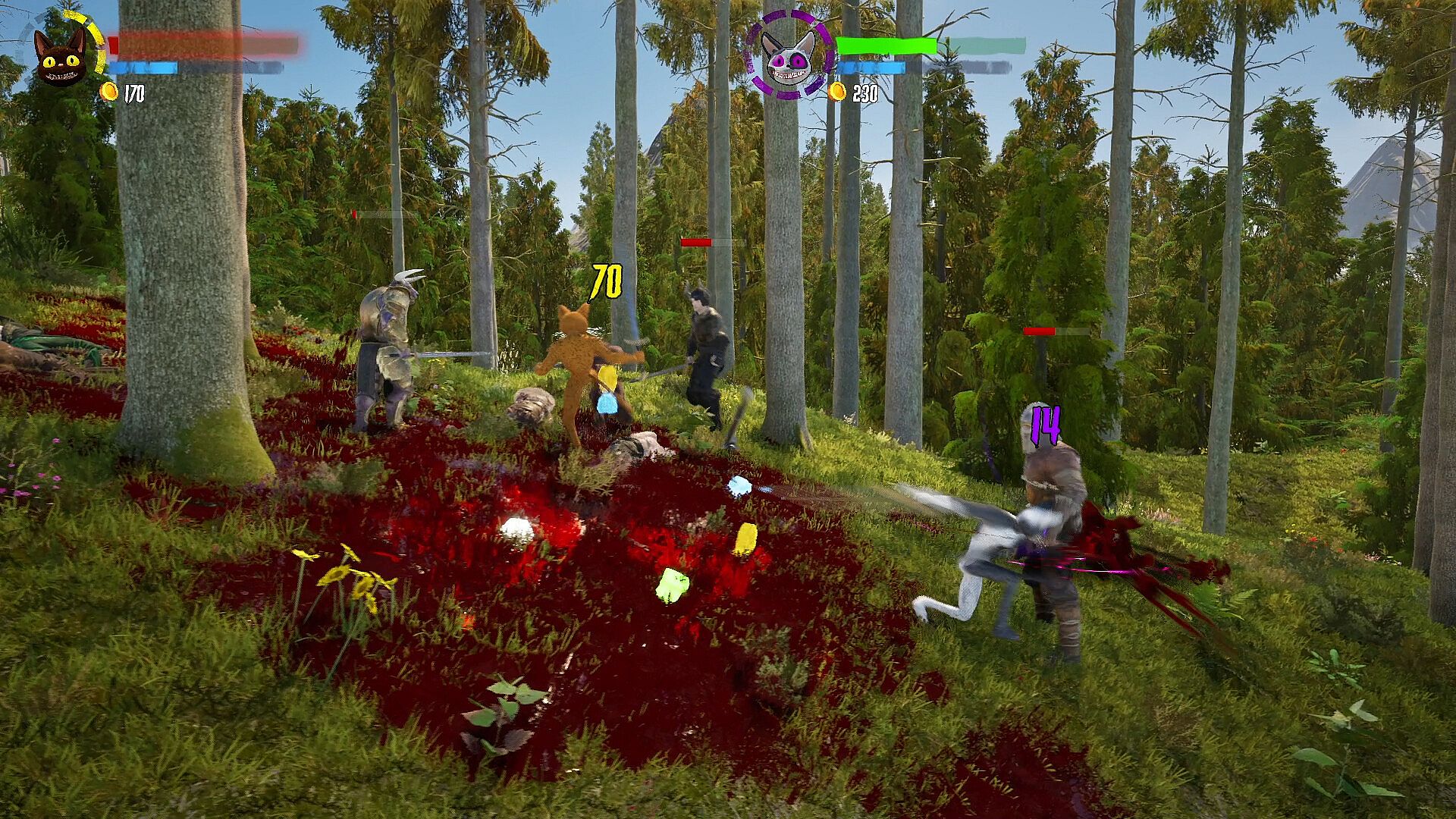 Slaughter Cats is a bloody side scrolling beat'em up platformer fusing intense combat and fun platforming in a vivid and varied world. Players can play by themselves or play locally or online with up to four people in 3 different modes: Arcade, Horde and Deathmatch. Battle across stunning landscapes utilizing a complex combat system and magical abilities to help you shower in the blood of diverse challenging enemies from angry viking and orc raiders to slippery ninjas and nefarious necromancers. Slaughter Cats takes inspiration from classic beat'em ups such as Golden Axe and Castle Crashers and combines that with influences from platforming greats such as Crash Bandicoot and Mario to come up with a unique fusion of the genres with a little extra splash of blood.