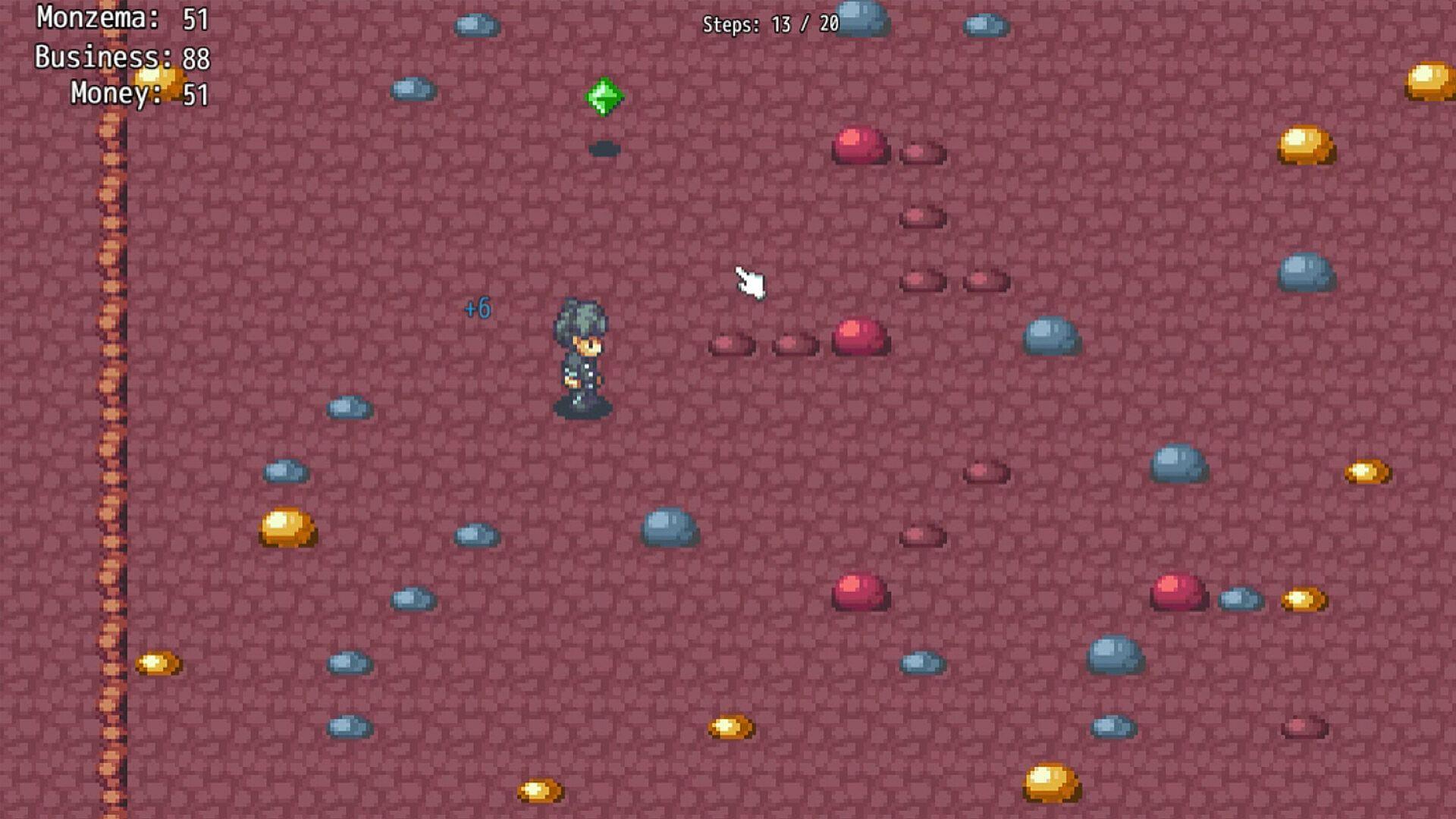 Monzema Hunting - This is a progressive mini game where you move to collect Monzema from Slime Monsters in a given step count. In the beginning you'll have only a few steps to take with limited number of slimes to hunt, but as you earn more Monzema and convert it to Money, you can upgrade various perks to help you more effectively farm Monzema.