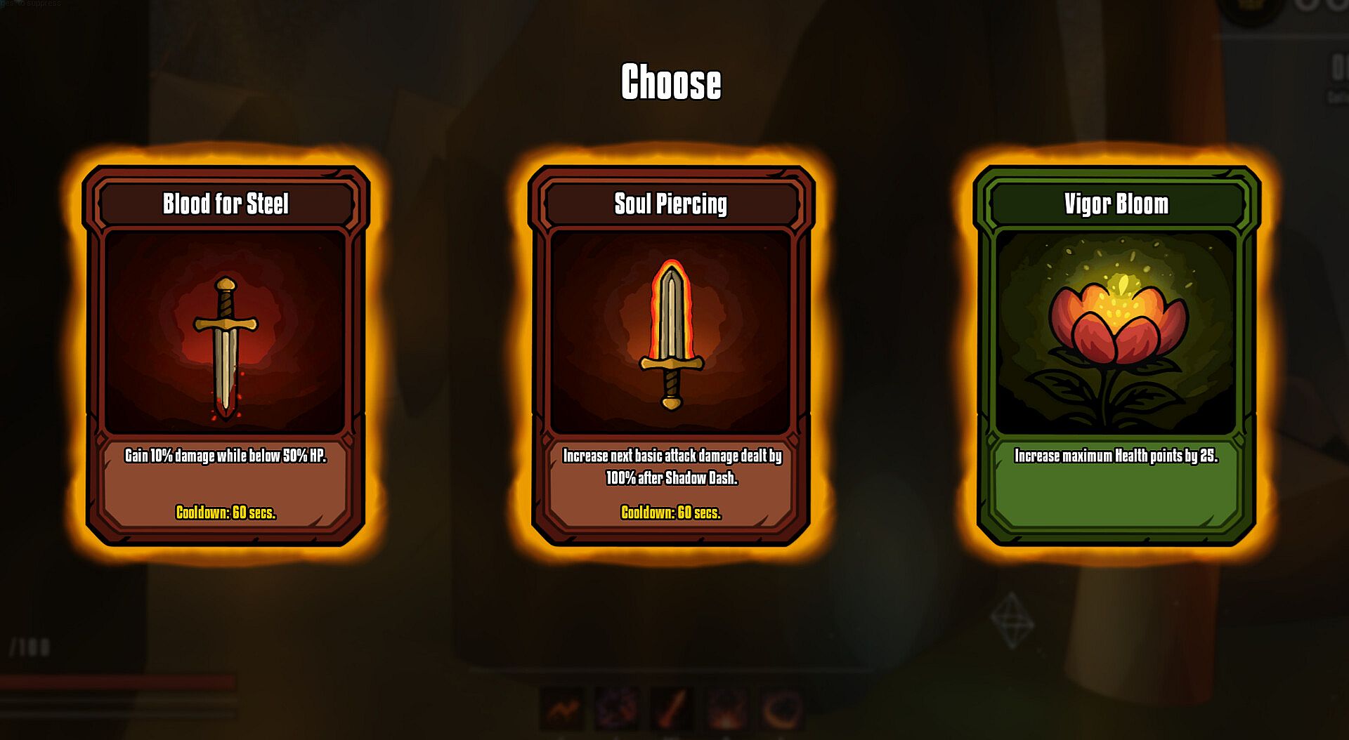 Each time you level up in game, you choose one of three cards from your deck. These cards grant upgrades, abilities, or stat boosts that shape your build for the run. Your choices directly impact your combat style and survivability.