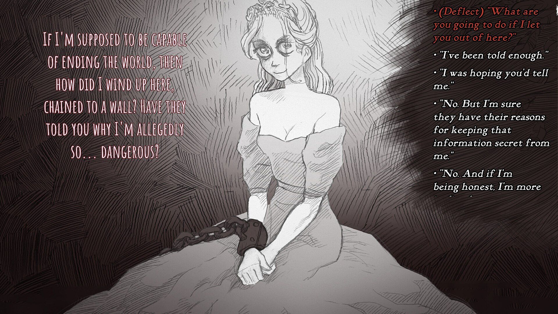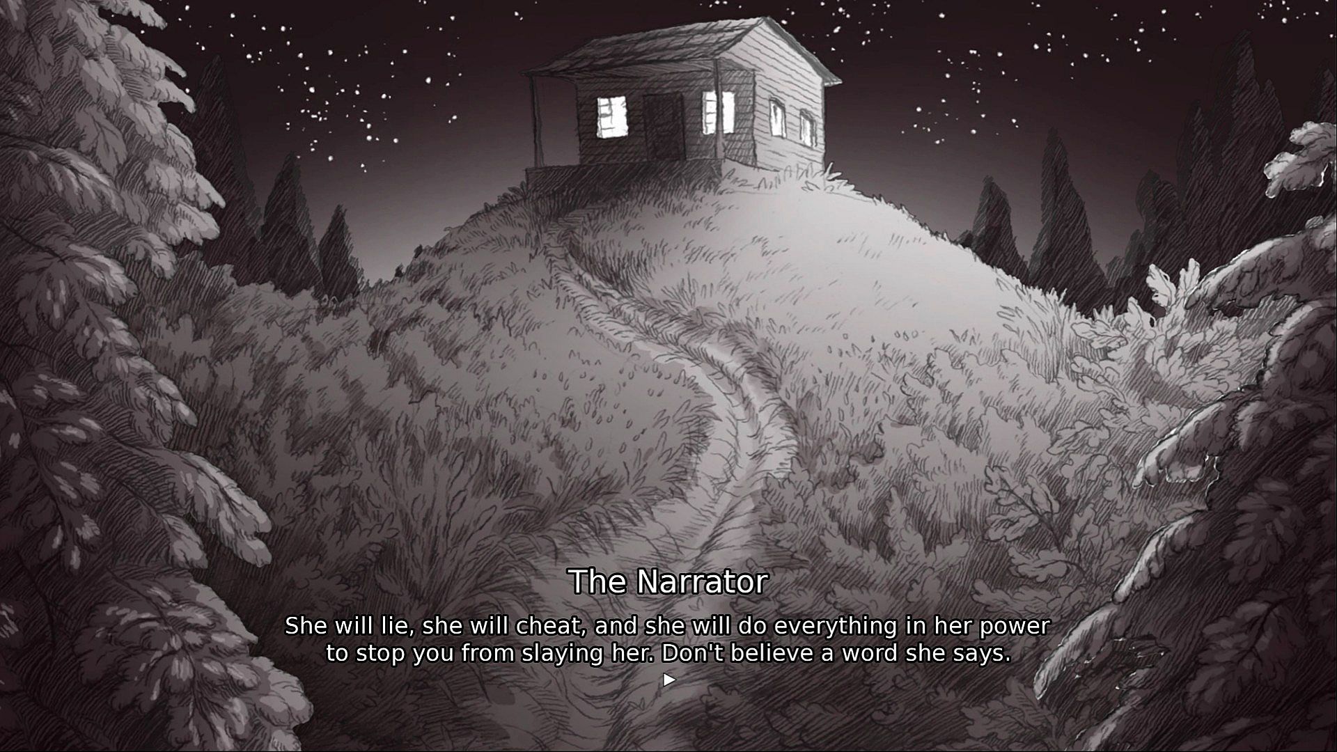 You're on a path in the woods, and at the end of that path is a cabin. And in the basement of that cabin is a Princess. You're here to slay her. If you don't, it will be the end of the world. She will do everything in her power to stop you. She'll charm, and she'll lie, and she'll promise you the world, and if you let her, she'll kill you a dozen times over. You can't let that happen. You do care about the fate of the world, right? Slay the Princess - The Pristine Cut is a fully voice-acted horror tragicomedy featuring the impeccable talents of Jonathan Sims and Nichole Goodnight, with lovingly hand-penciled frames by Ignatz-winning graphic novelist Abby Howard. This game features a princess. She's very bad and you have to get rid of her for all our sakes. She's just an ordinary human Princess, and you can definitely slay her as long as you put your mind to it. Hopefully you won't die. But if you do, you'll die a lot. Be careful and stay focused on the task at hand! What you say and what you believe will shift the story in dramatic ways. Ah, but what’s in the Pristine Cut? Are you sure you want to find out? If you do, you’re likely to discover things that are best left experienced directly. Seriously, turn back. … Oh, you’re still reading? Very well, I shall tell you. The Pristine Cut contains, precisely: - 3 brand new chapters replete with mysteries—and consequences. - Never before seen Princesses who will all murder you without a second thought. - Expansions to familiar routes: The Den, The Apotheosis and The Fury each have more than doubled in length. - Over 35% more content overall—and all of it filled with great opportunities to listen to me and do your job. - A new ending. And hopefully one that saves the world rather than damns it. - Gallery to Track Your Progress: Cherish your memories, relive your exploits, and uncover deeply hidden secrets with the new gallery feature. - Over 1,200 New Hand-Penciled Frames hand-illustrated by Abby Howard. - Over 2,500 New Lines of Dialogue fully voiced dialogue by the impeccable Jonathan Sims and Nichole Goodnight. Yes, prepare yourself for an expanded journey filled with new perils, difficult choices, and unforgettable encounters. Will you stay on the path to slay the Princess, or will the new chapters alter your fate? (That said, while I wish free-will weren’t a thing here, I cannot emphasize this enough: you have to slay her. Please.)