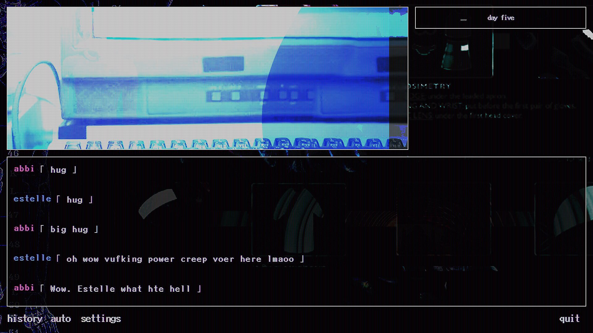 With no known cure for a Host infected by Miasma, Estelle spends the remainder of her days exchanging messages with her closest coworker, Abbi. Together, they do their best to feel intimacy by being perverts together while staring the looming, macabre regression toward death straight in the eye.