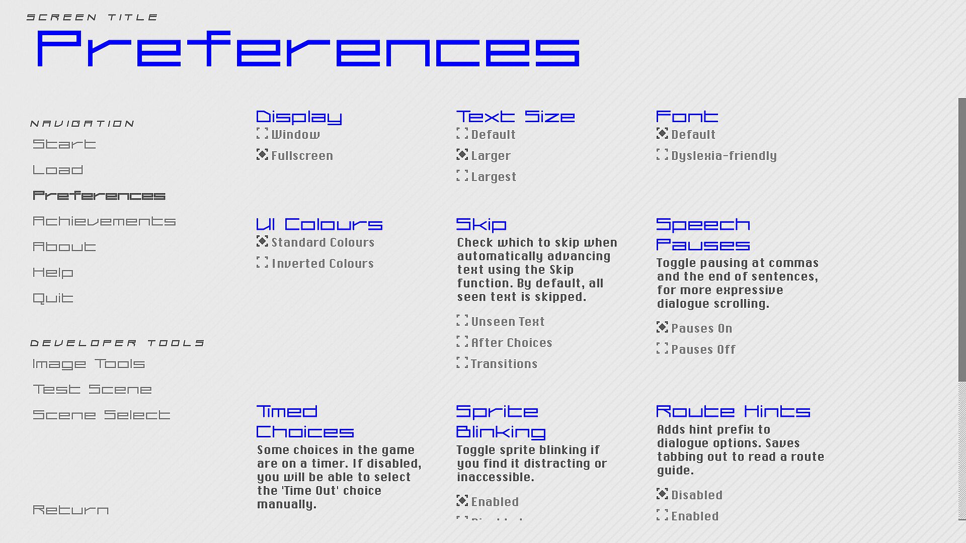 Accessibility features including text size and font, dark mode, and ability to disable animations and choice timers