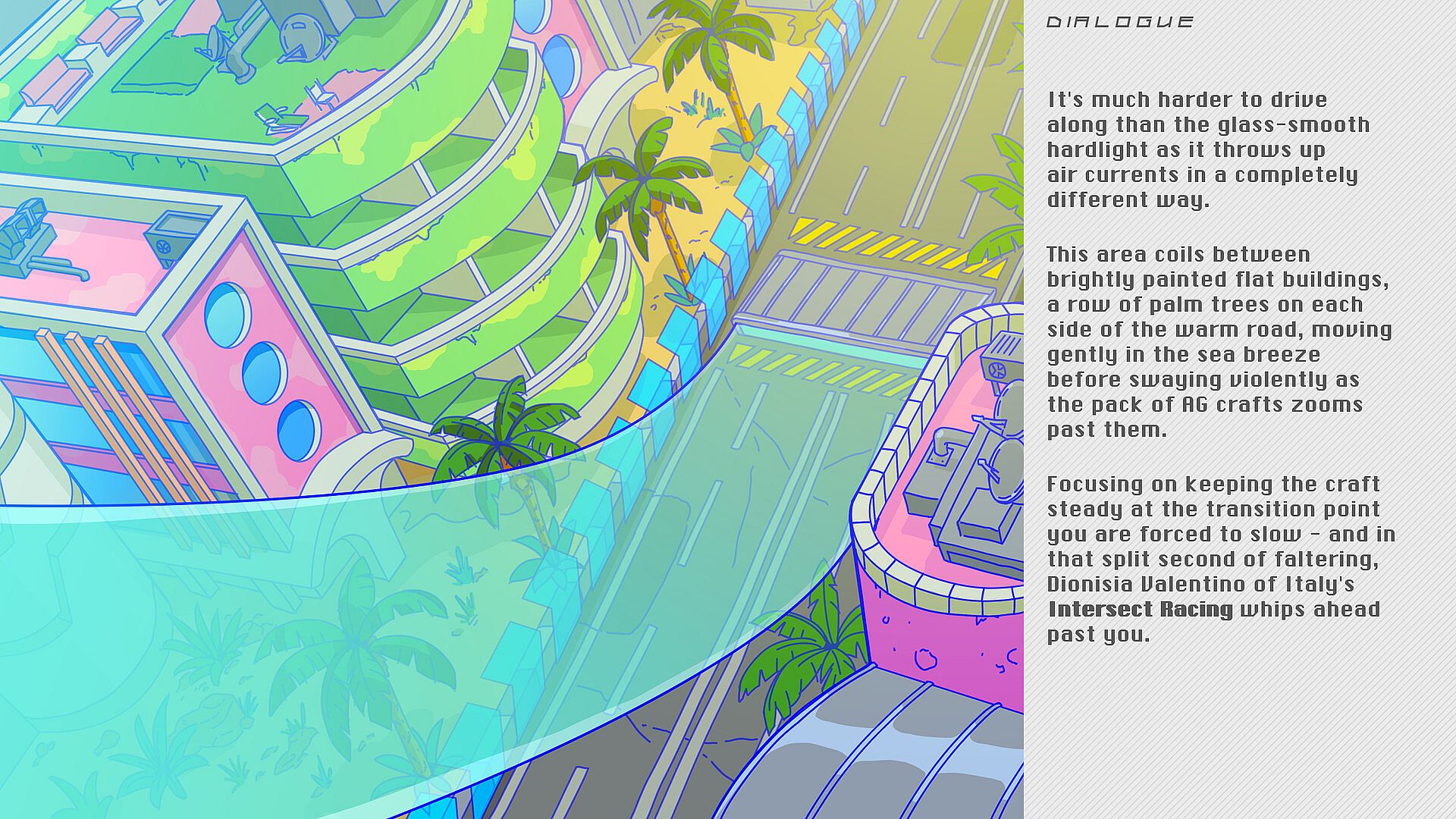 Slipstream Daydreams is a y2k inspired retrofuturistic visual novel about anti-gravity racing and messy queer romance. Follow Orion Cruz, rising star of the Anti-Gravity Racing League, as they race through the final and reminisce about their relationships with other drivers throughout their first year in the sport. Your split-second choices affect which romantic flashbacks you see!