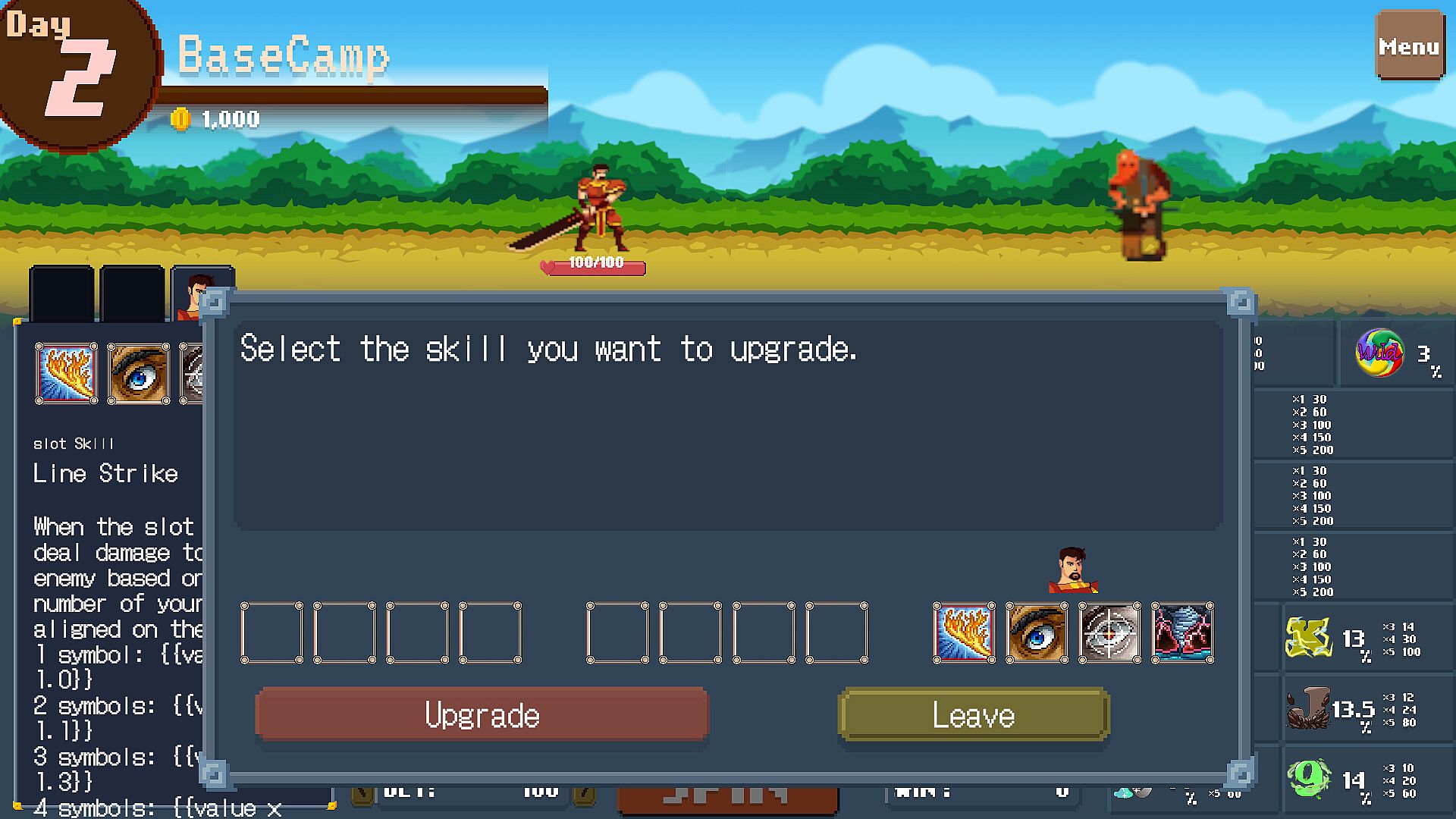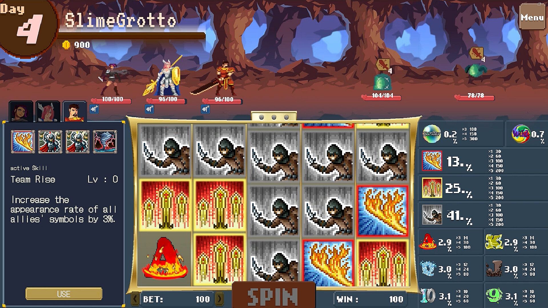 Spin the reels of fate and activate your heroes’ skills according to the outcomes.