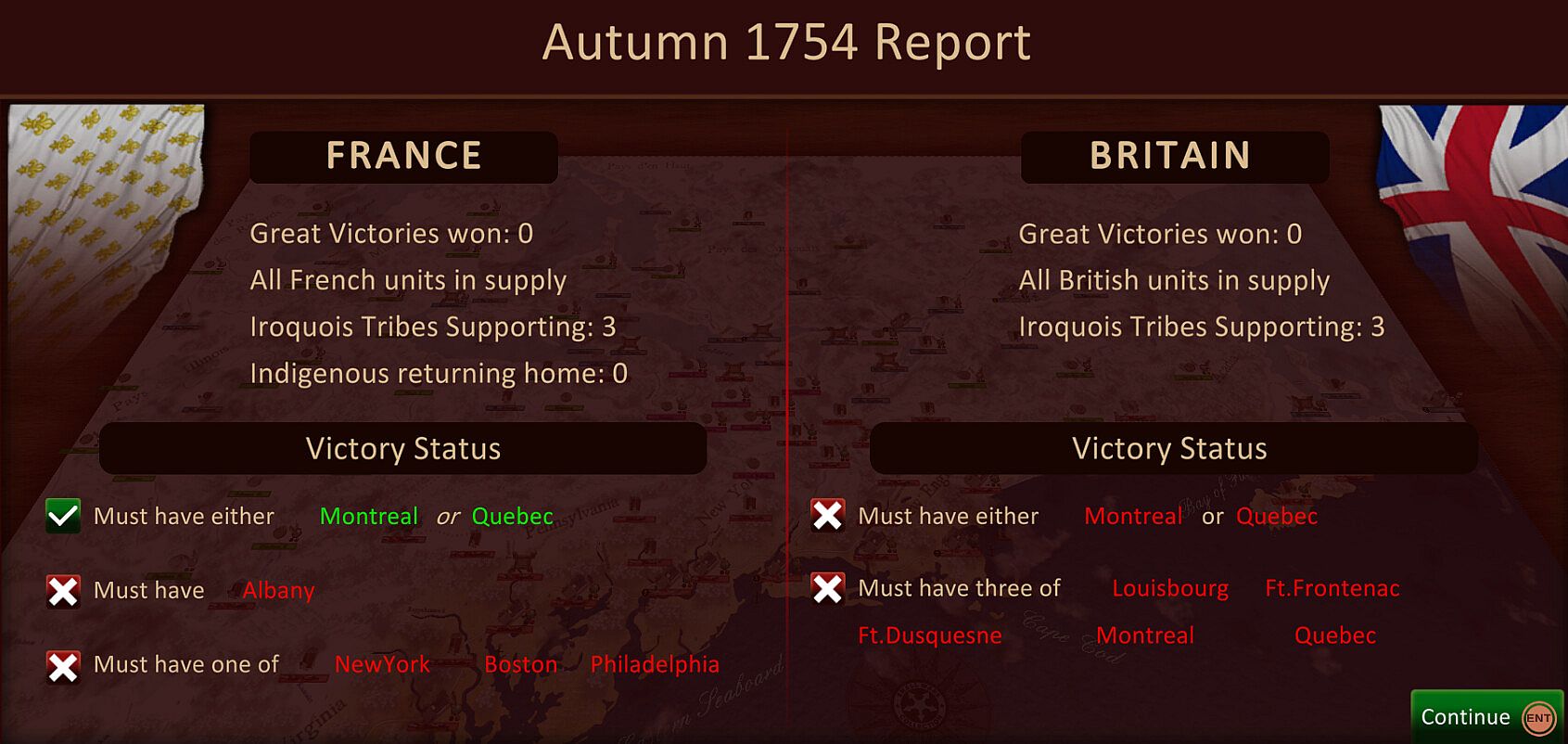 The French can also win by holding the British cities of Albany and either New York, Boston or Philadelphia. This will be a tall order for the French but they can take comfort in the fact that the British, like NATO 250 years later have the watches, but the French have the time…