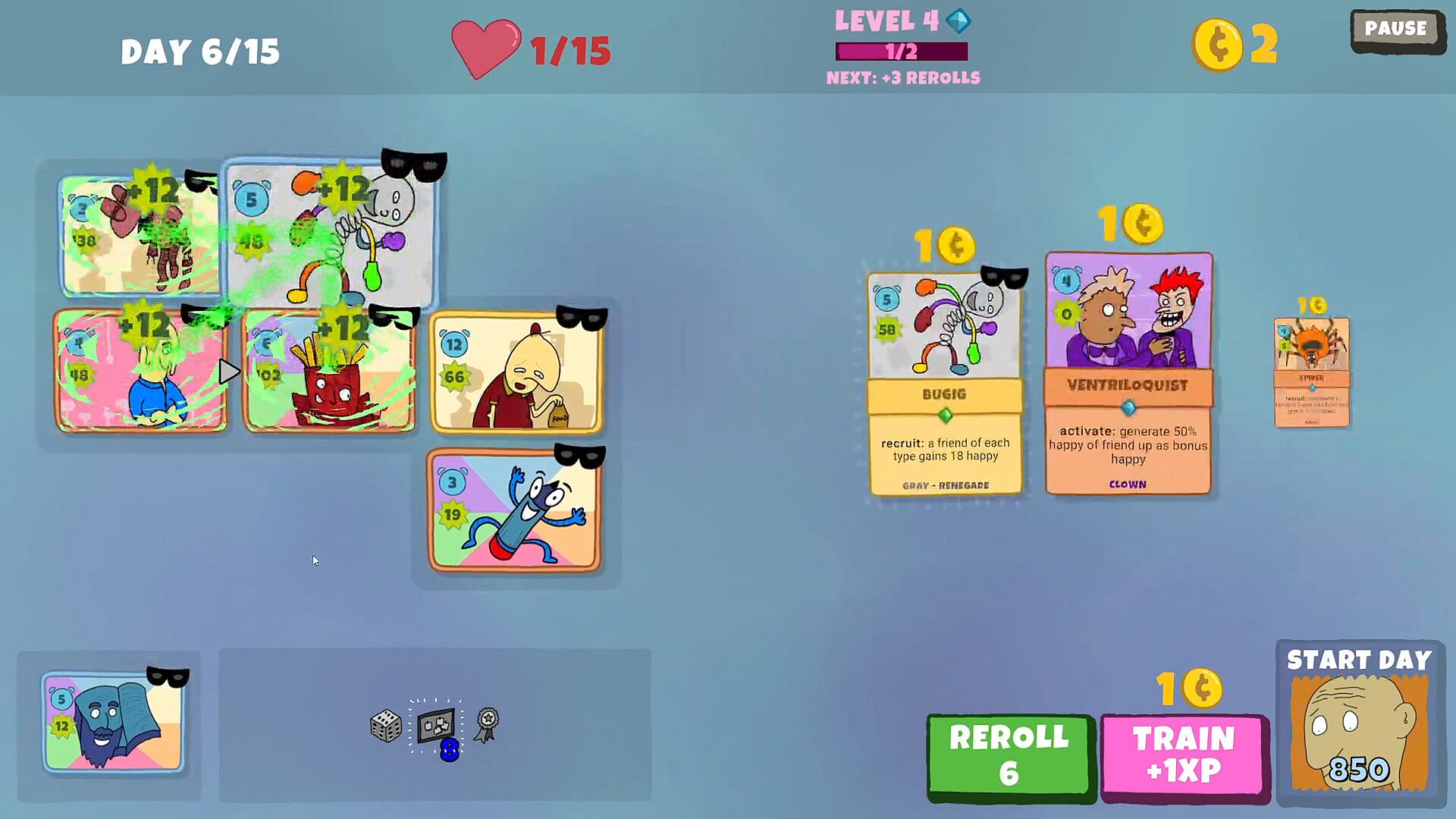 After each workday, you earn coins that can be spent to improve your team: hiring stronger friends, modifying them with tarot cards, discovering powerful relics, or training to level up.