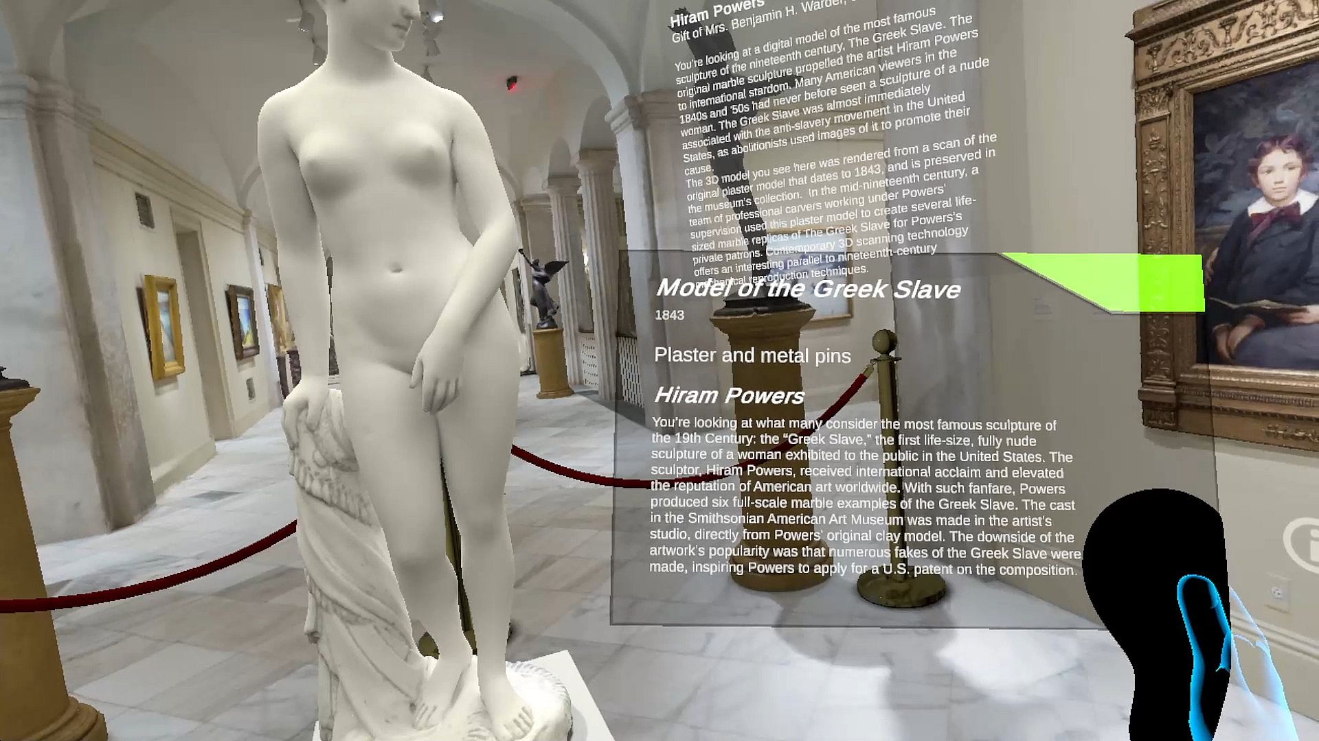 Go Beyond the Walls, a virtual reality experience that puts users directly in the museum’s galleries of the Smithsonian American Art Museum! Beyond the Walls blends photoreal imagery of artworks from SAAM’s collection with augmented elements to let users interact with and learn about the museum’s collection using a headset and handheld controller.