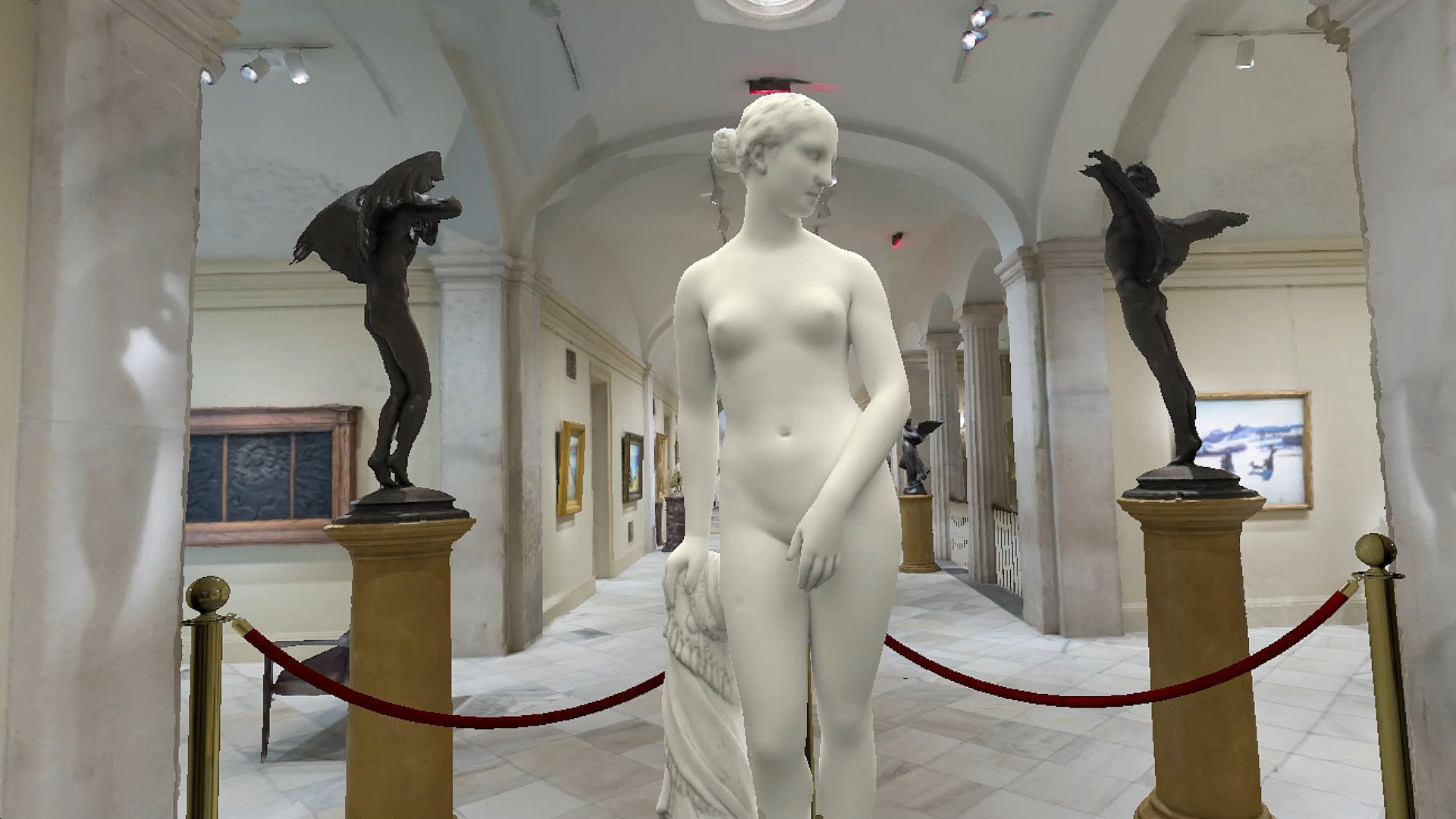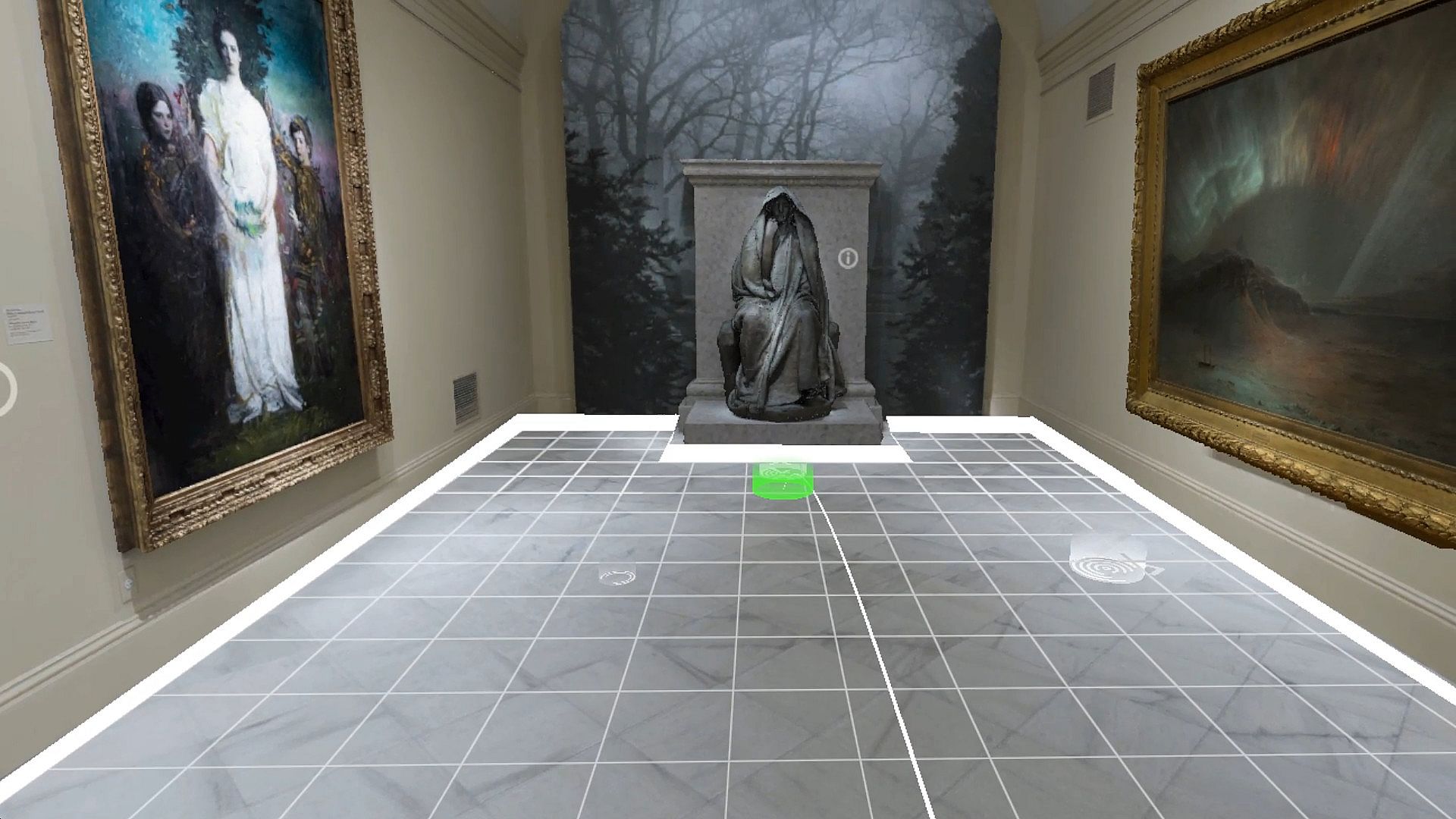 This virtual museum includes three unique pieces for users to engage with, leading to a broader, interactive experience of the original art pieces. Users are able to move freely around the museum’s east wing from inside their headsets, and view a dozen paintings, four works of sculpture, and one video art installation in high fidelity. Upon approaching Adams Memorial, users are transported out of the museum and into a 3D volumetric recreation in Rock Creek Park Cemetery, can experience a 360-degree, 6K video of an actual aurora borealis, and are greeted by a volumetric hologram of the artist Alex Prager explaining the inspiration for the 2013 film, Face in the Crowd.