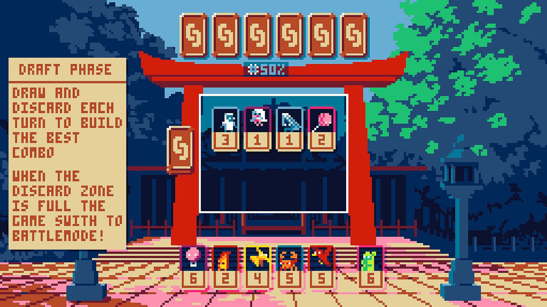 • In draft phase, you must refine your hand by drawing and discarding cards, while your opponent does the same. Discarded cards are placed in the center, where any of the two players can pick them up again instead of drawing a new random card. When the discard zone is full, it's time to fight!