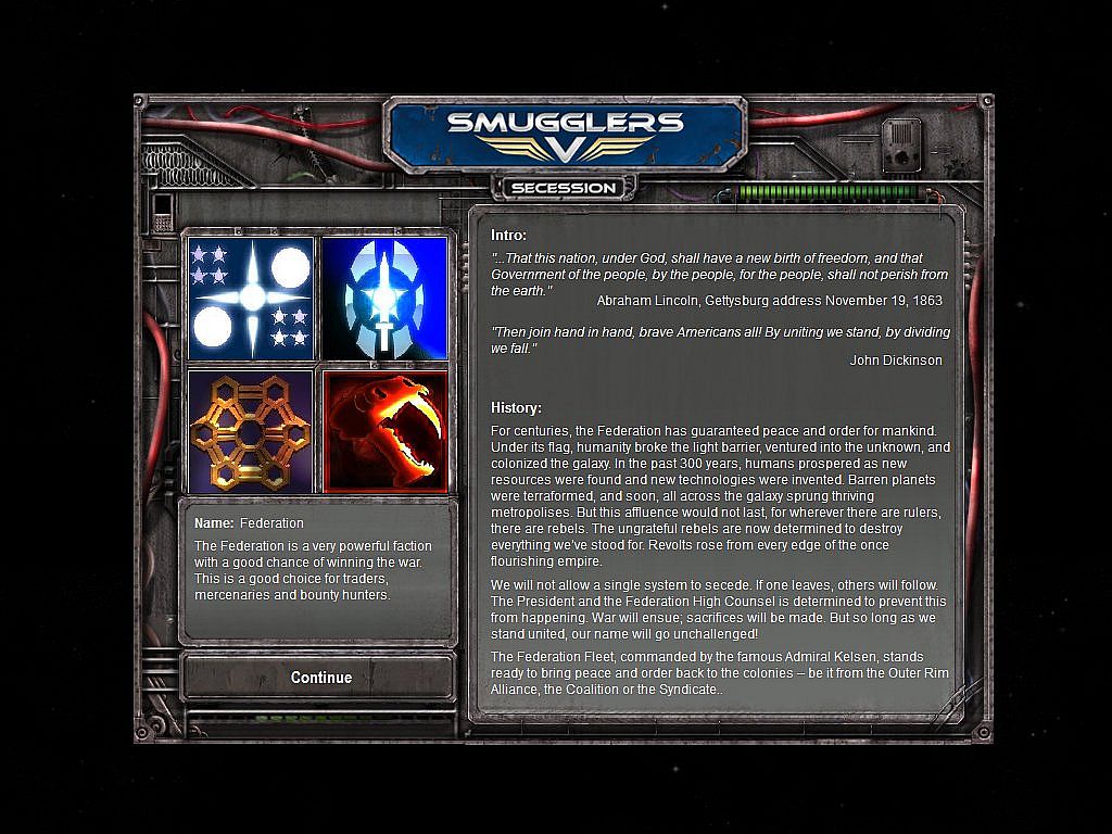 The galaxy is at war - the Federation, the Coalition, the Outer Rim systems and the criminal Syndicate battle for control. It's a dangerous life for a pilot on the front lines, but it can also be a lucrative one - are you an honest trader, or does smuggling illegal goods sound more profitable? Will you join the war effort for your faction, set up your own empire or simply explore the galaxy?