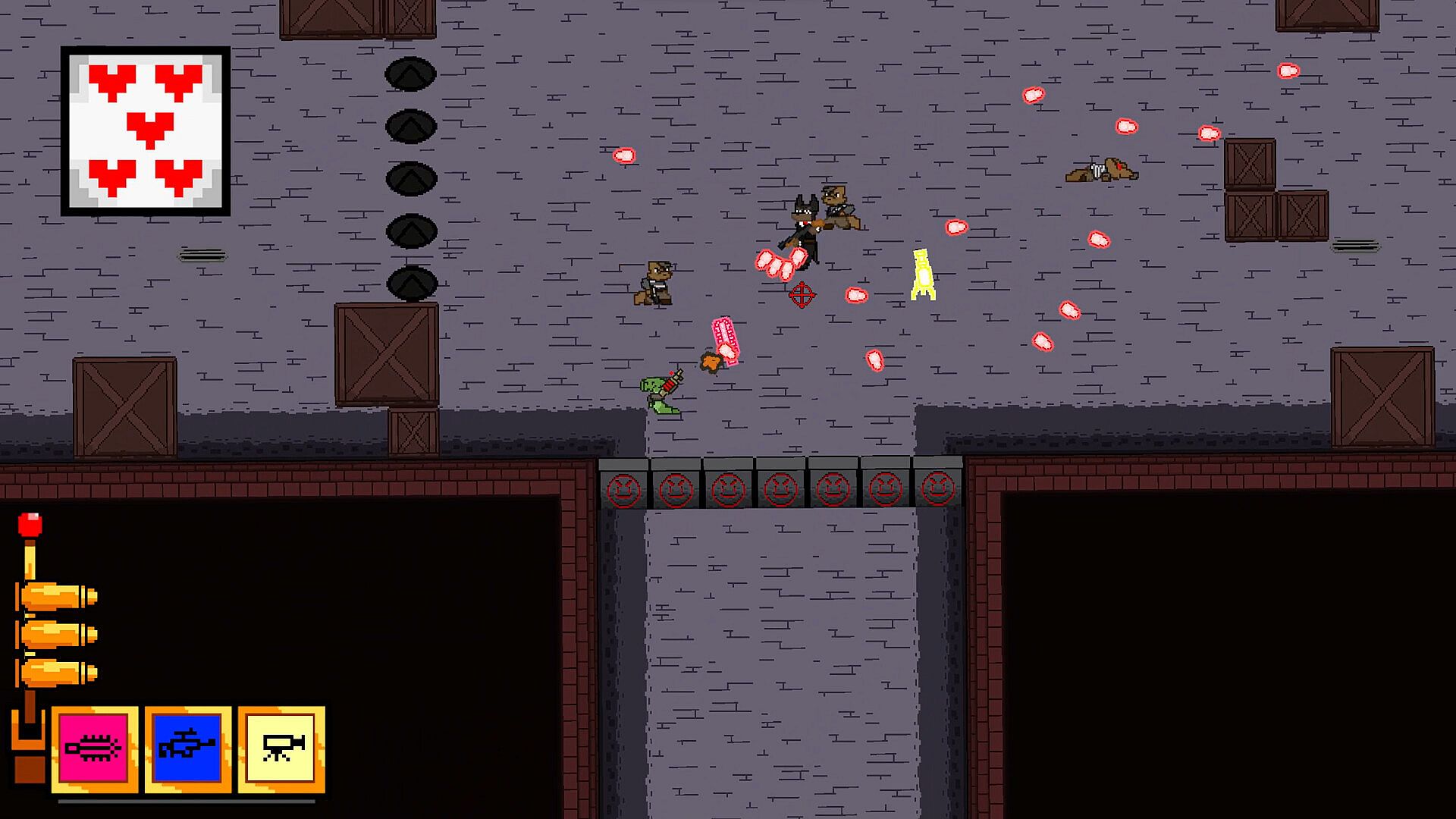 Snake Eyes is a bullet hell top down 2D rougelike where you assume the role of a vengeful snake on a quest to take down the casino that took her arm. Using her homemade Slot Machine Gun, she'll parry, dodge, and blast her way through the Snake Eyes Casino while finding unique items to assist her on the path of vengeance. Shoot your way through the streets, game rooms, and VIP lounges of the Snake Eyes Casino with an array of unique bullets and items.
