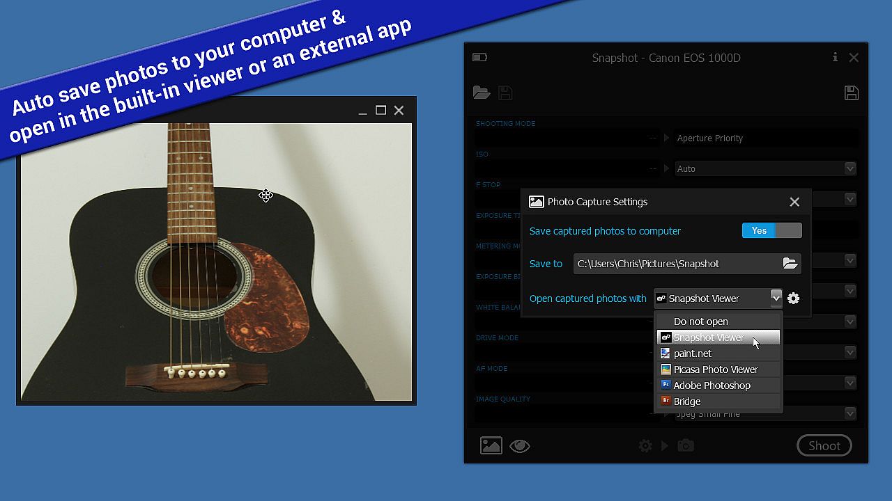 Snapshot gives you the option automatically save captured photos to a folder on your computer.