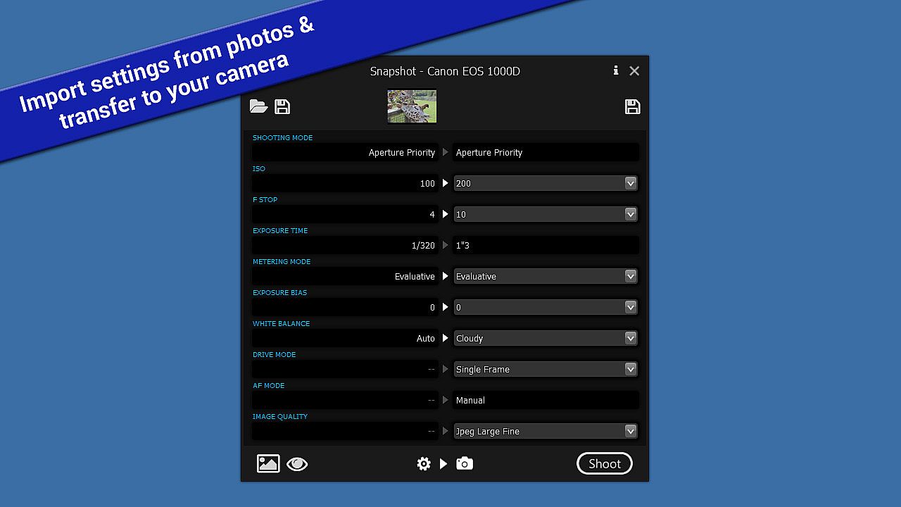 Import camera settings from digital photographs by extracting the settings (ISO, F Stop, Exposure Time, etc) that were used when the photograph was taken, and set up your camera in exactly the same way. This can give you a good starting point for taking similar shots, and help you get to grips with the overwhelming range of settings your digital SLR camera has to offer