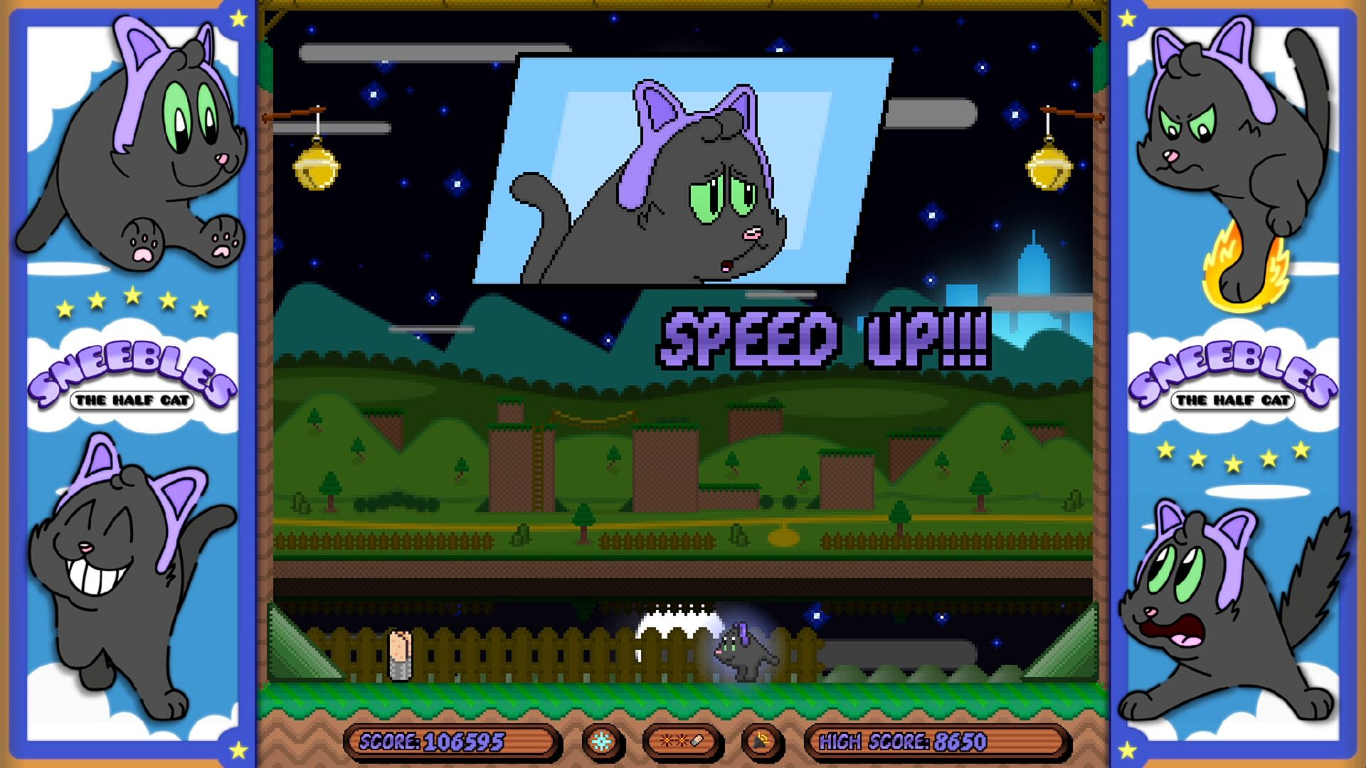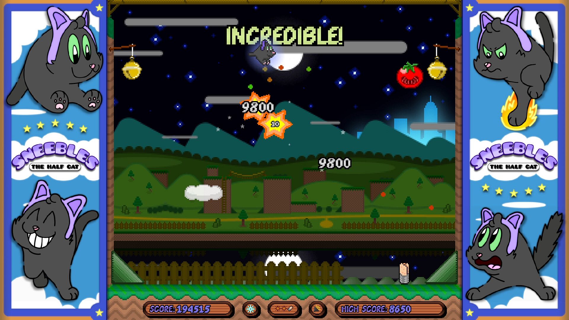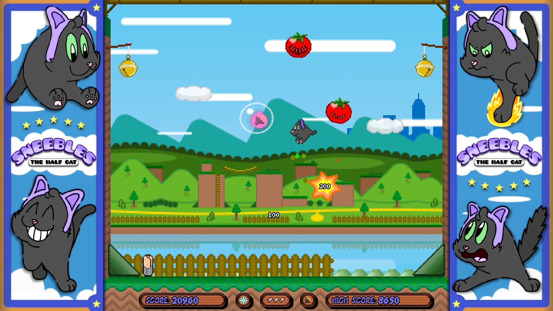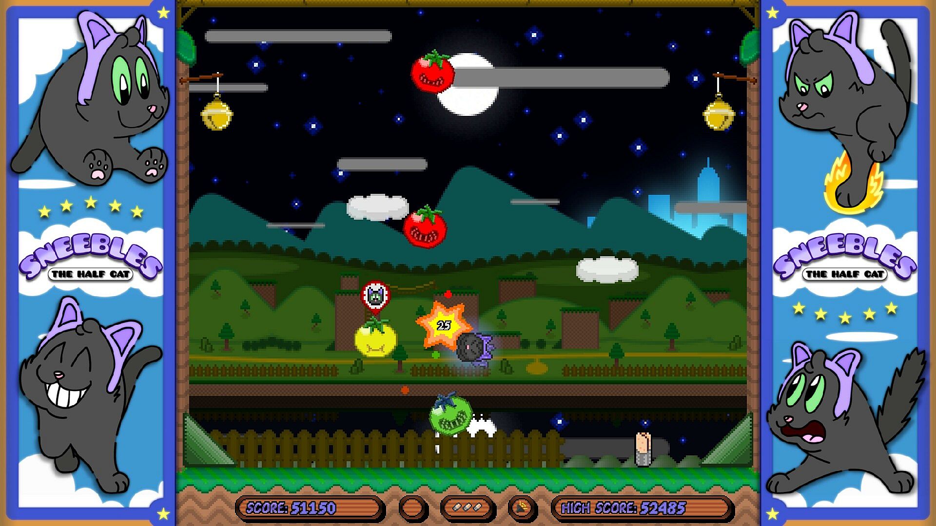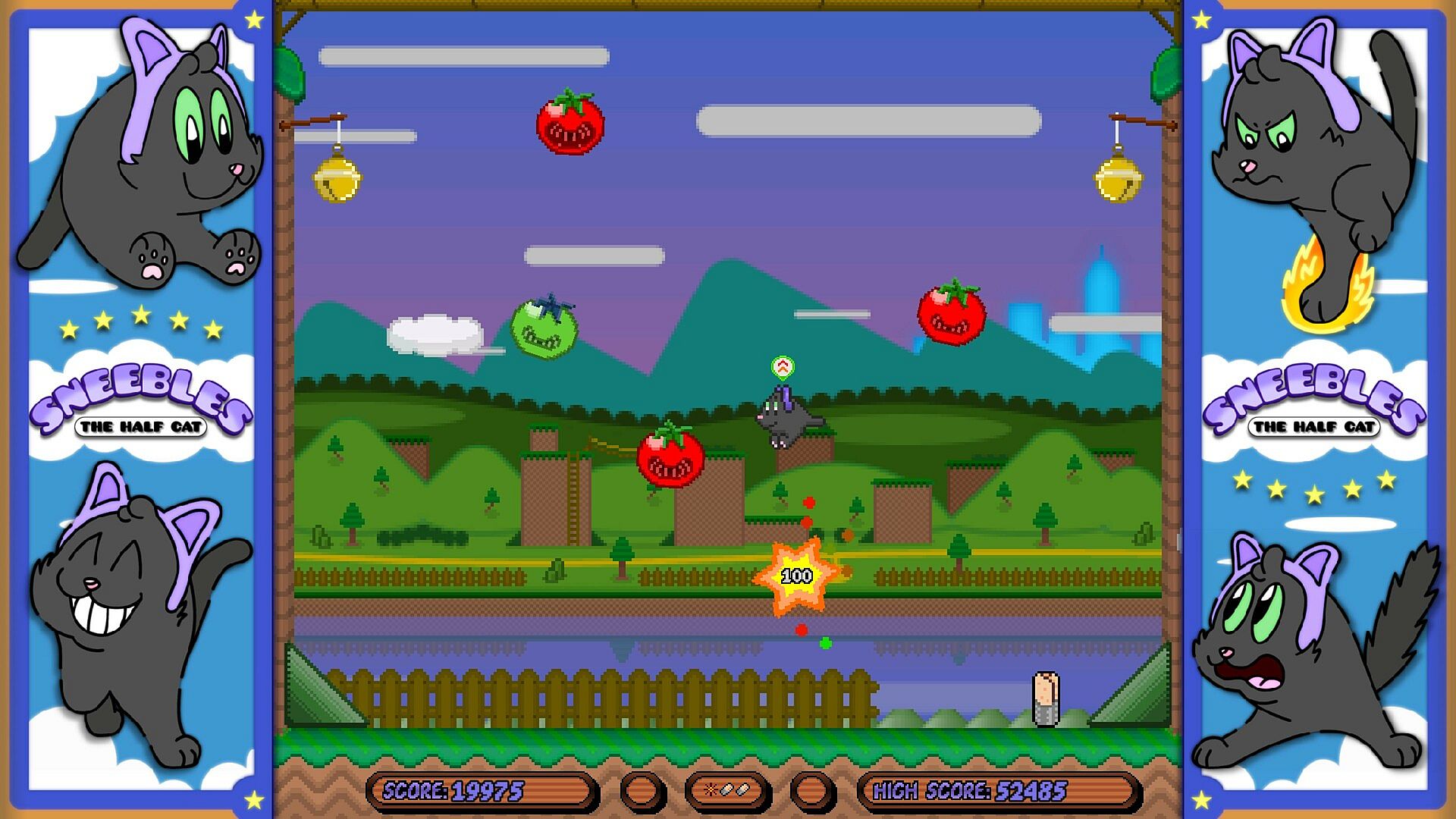 Sneebles The Half Cat is a fast-paced, white-knuckle retro style arcade game. Help Sneebles protect his burrito from mysterious giant tomatoes that are trying to destroy it. Where did they come from? Will Sneebles ever get a chance to eat his burrito? Find out as you unlock achievements and work toward new high scores!