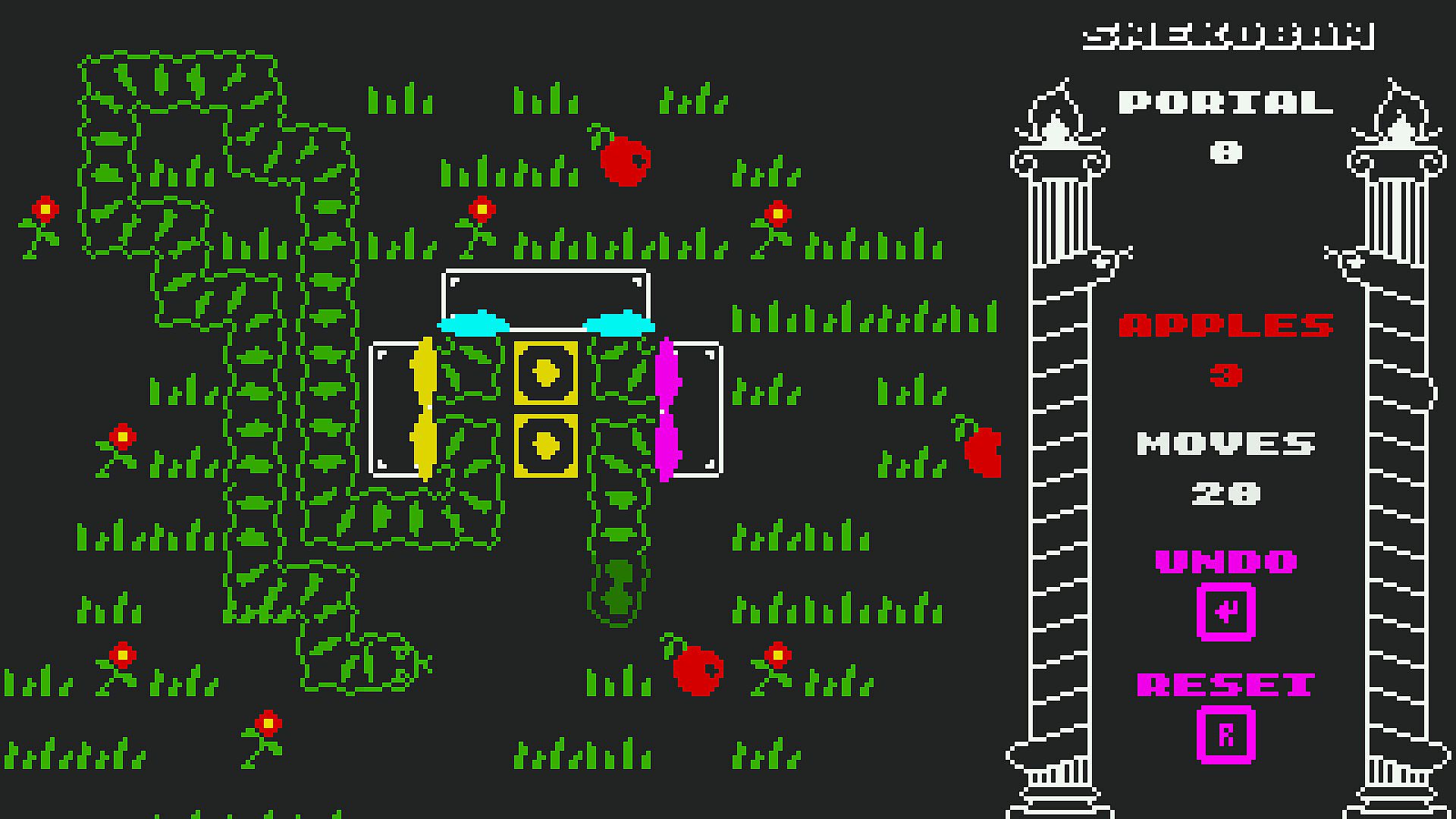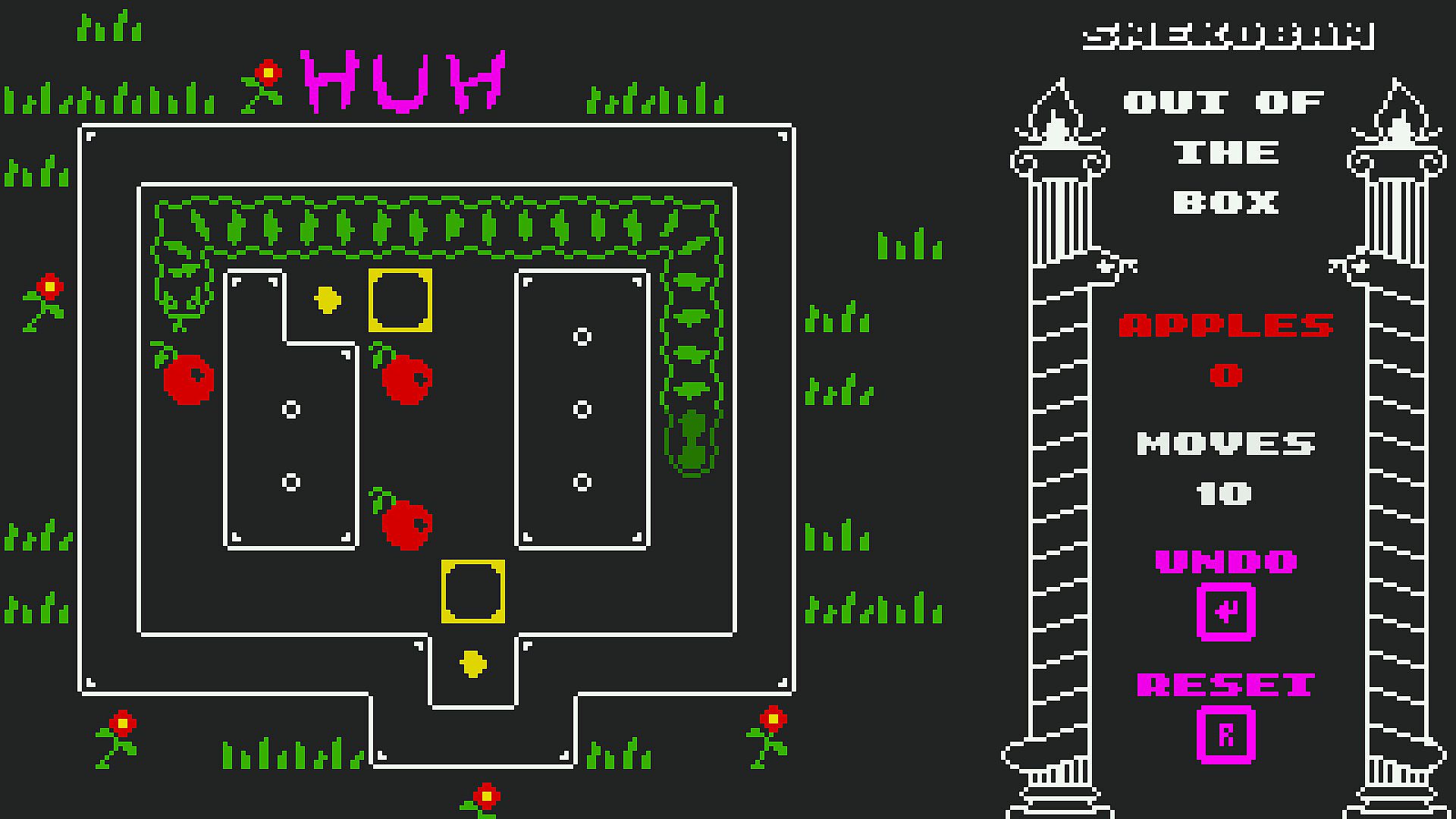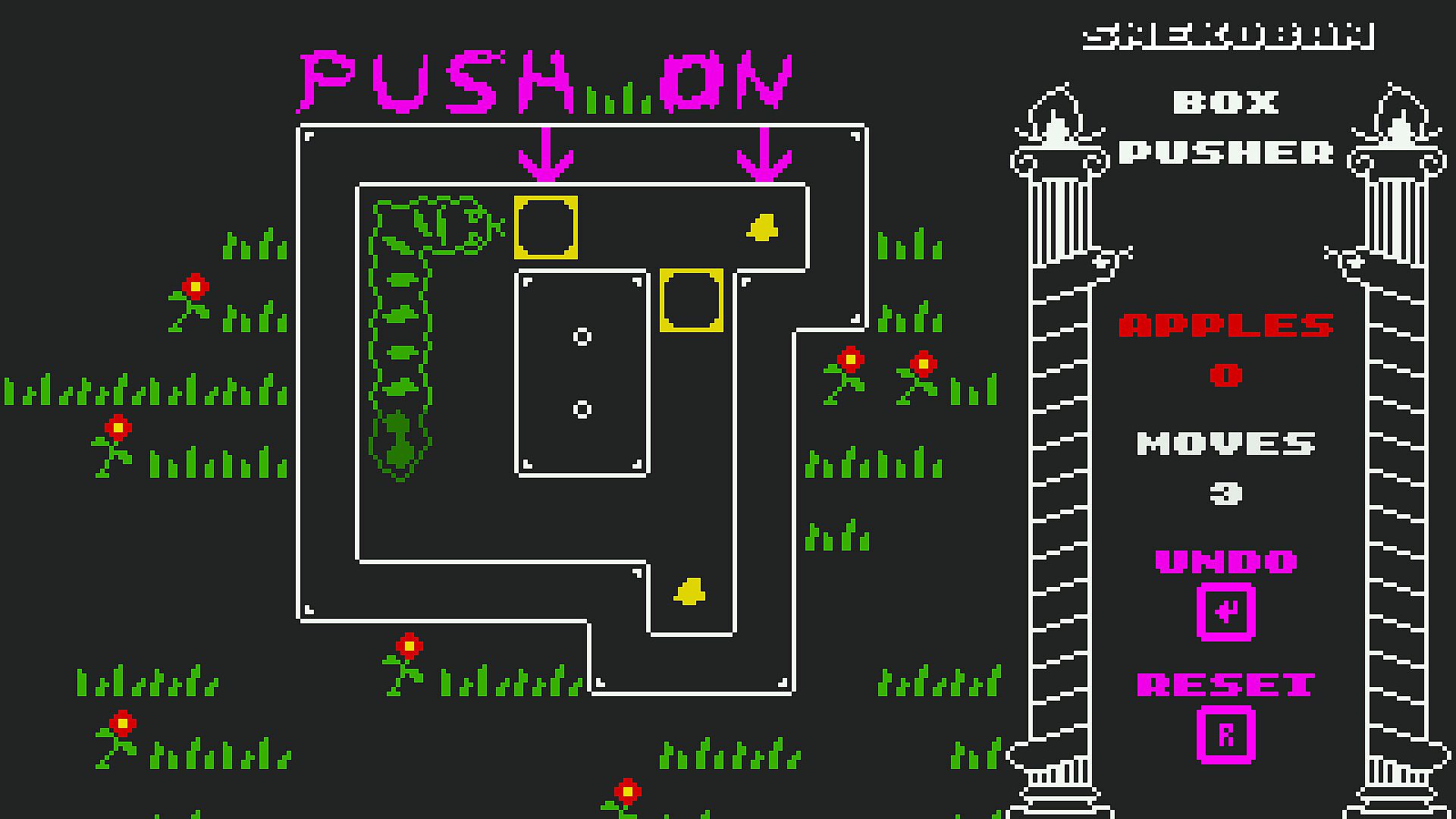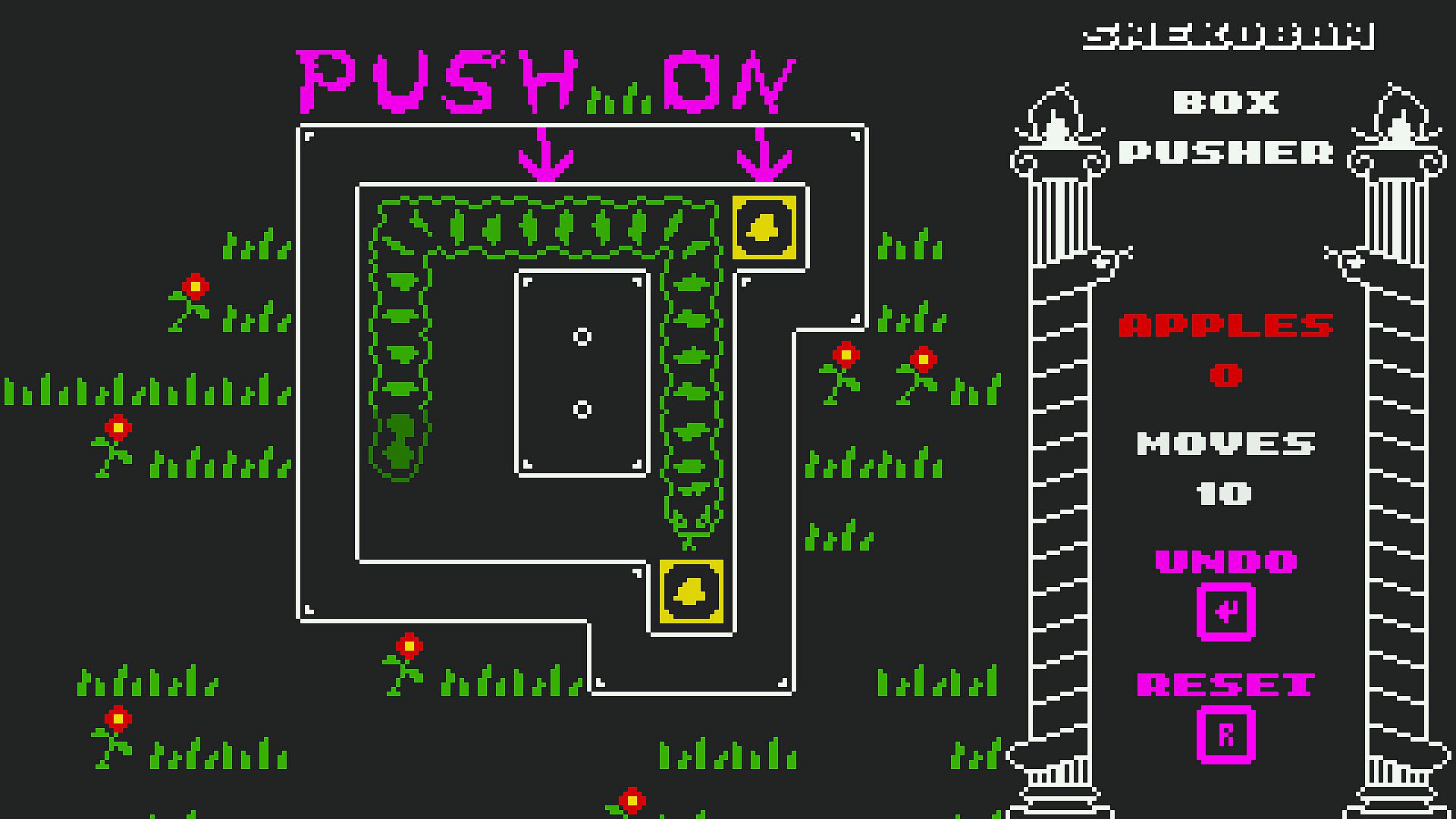 Snekoban is a puzzle game, inspired by Snake and Sokoban. Help Sneko tidy up his space by pushing boxes, eat apples and earn a well deserved sleep on his favorite pillow : his own tail ! But beware, Sneko can't move on a space he visited already !