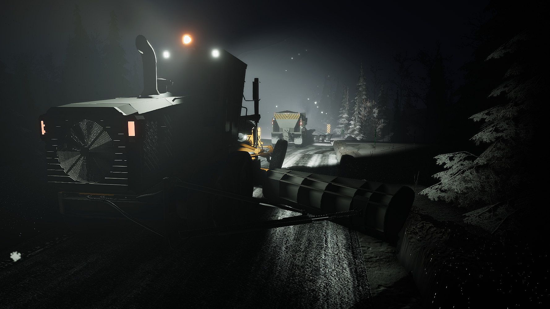 The most important part, the snow. Snow can be precisely plowed (without any "tiles" effects) while discharging a windrow on the appropriate side. Rolling snow and mist can be observed when plowing at significant speed, and the snow will gradually accumulate again if it keeps snowing. Snow banks or piles can be physically broken and taken away.