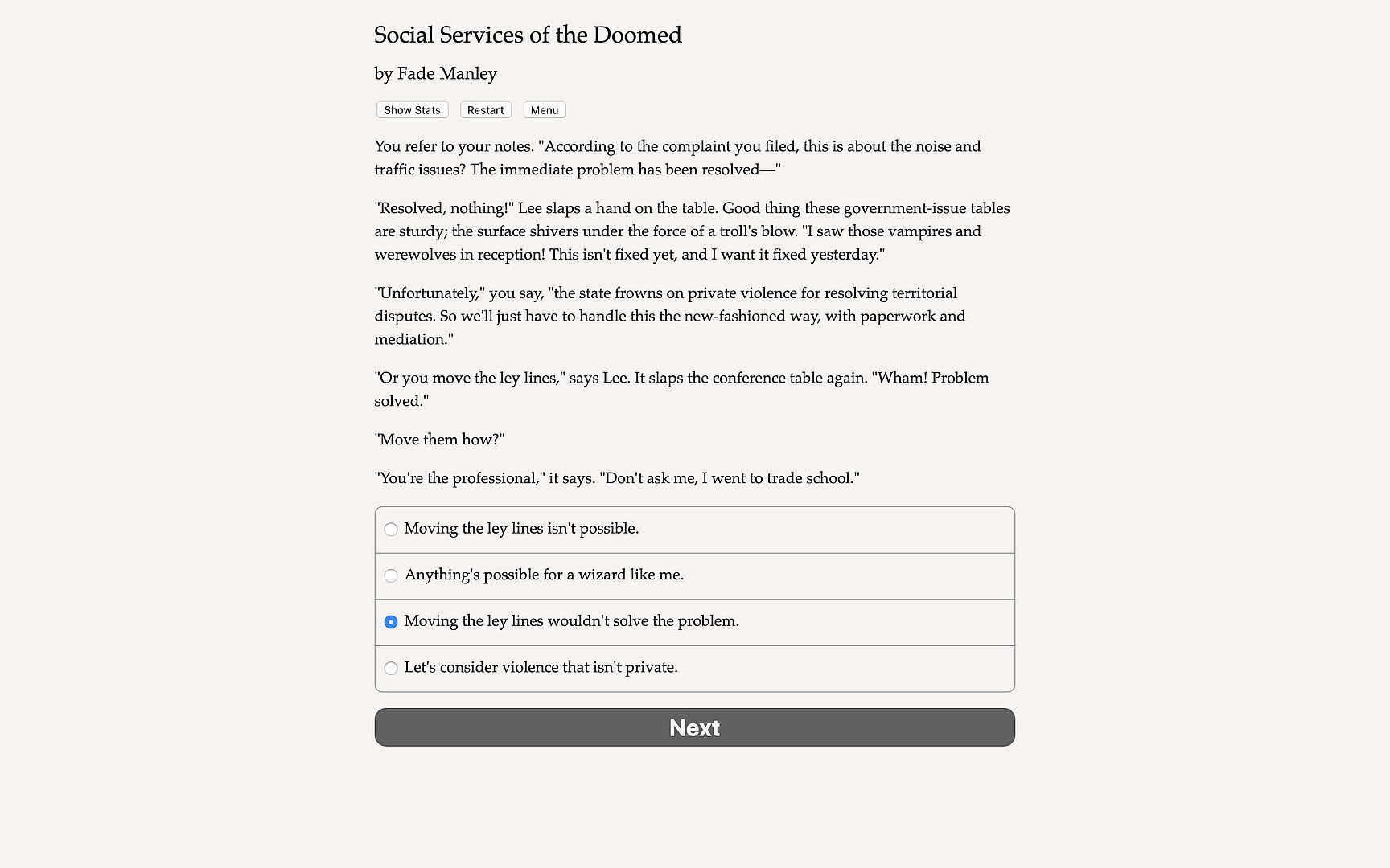Social Services of the Doomed is a 400,000-word interactive urban fantasy novel by Fade Manley. It's entirely text-based, without graphics or sound effects, and fueled by the vast, unstoppable power of your imagination.