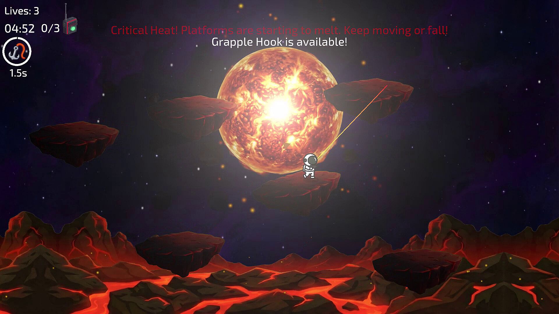 The ground beneath you is constantly melting away. Your thermal grapple hook is your only lifeline. Use it to instantly zip to the nearest safe platform or cross impossible gaps when you have nowhere left to run.