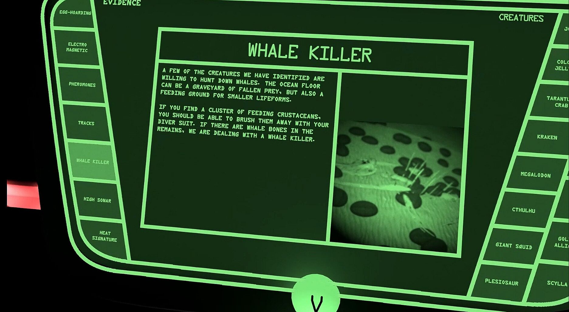 • Evidence: There are 7 possible evidence types to find from physical evidence such as whale remains to electromagnetic signals.