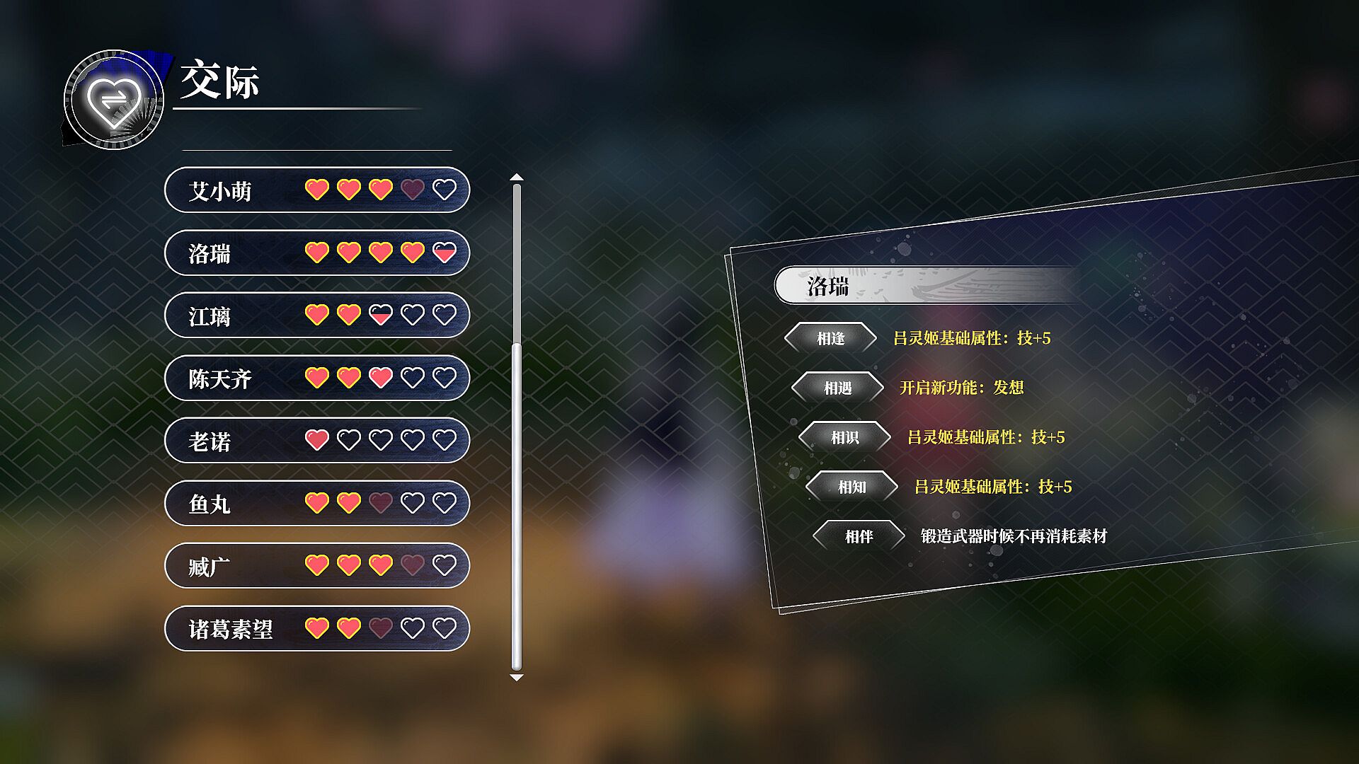 玩家将扮演吕灵姬在繁城内外结识多个人物,多达十二位可结缘的特殊剧情角色等待挖掘,在足够了解彼此之后他们或将成为你战斗时不可或缺的优秀助力,或会提供效果各异的强力增益,请根据自己的喜好尽情互动。