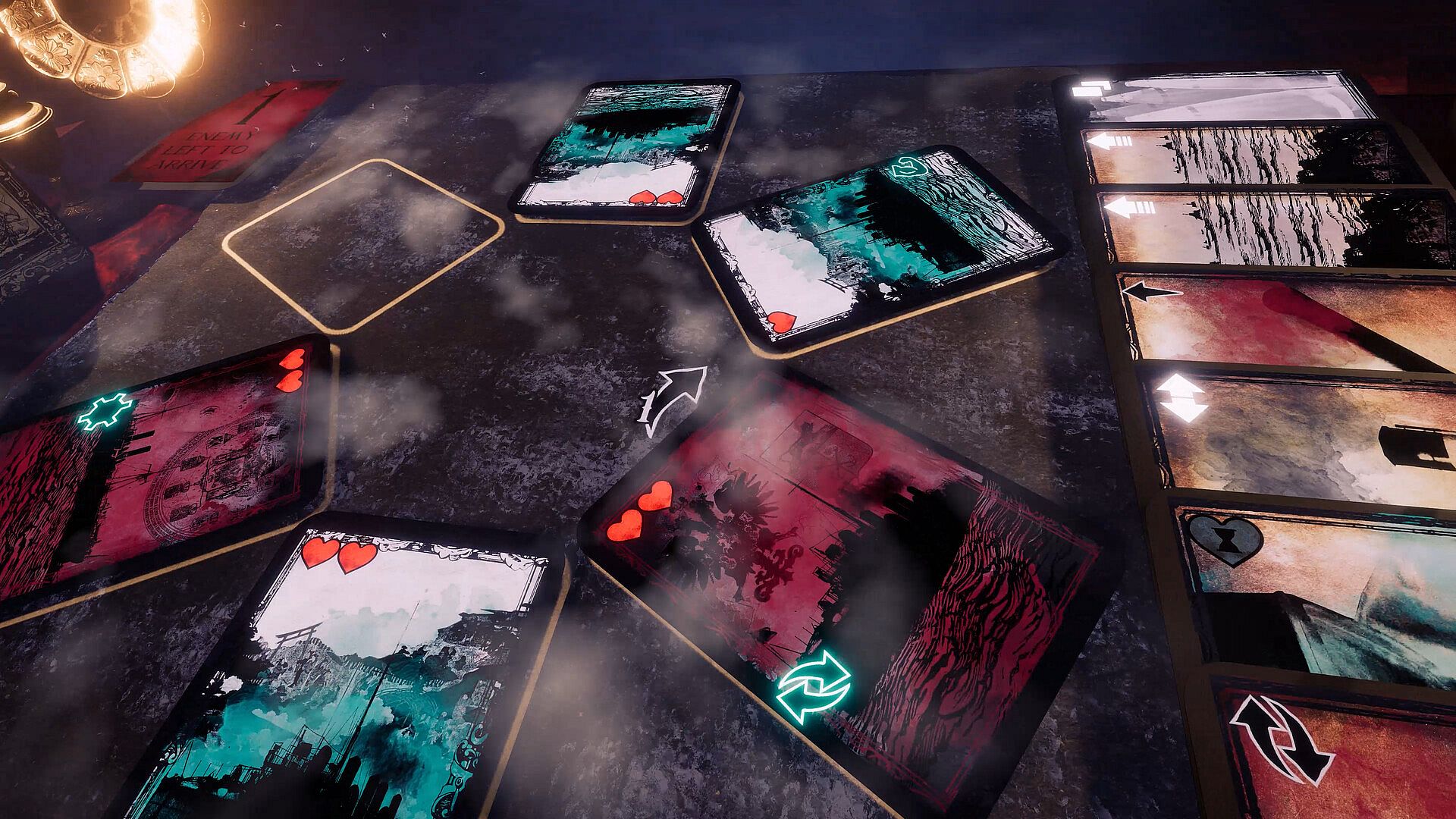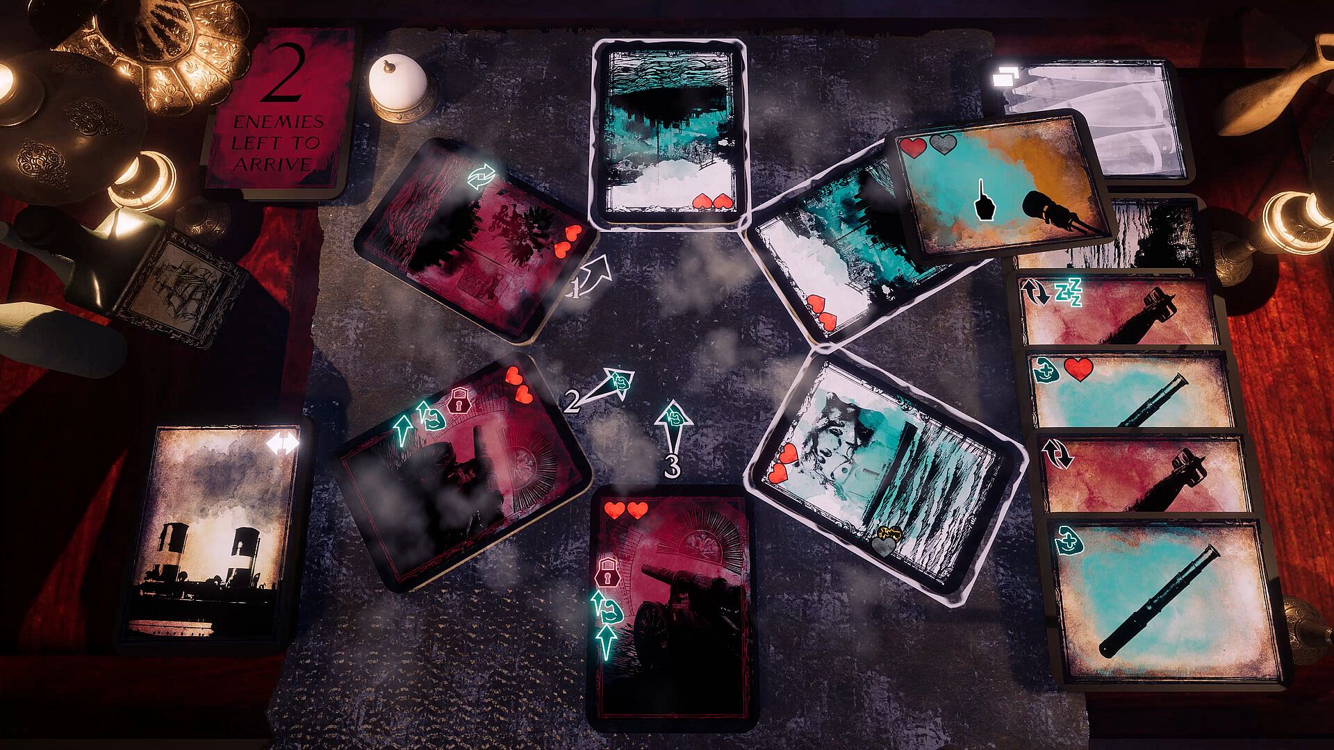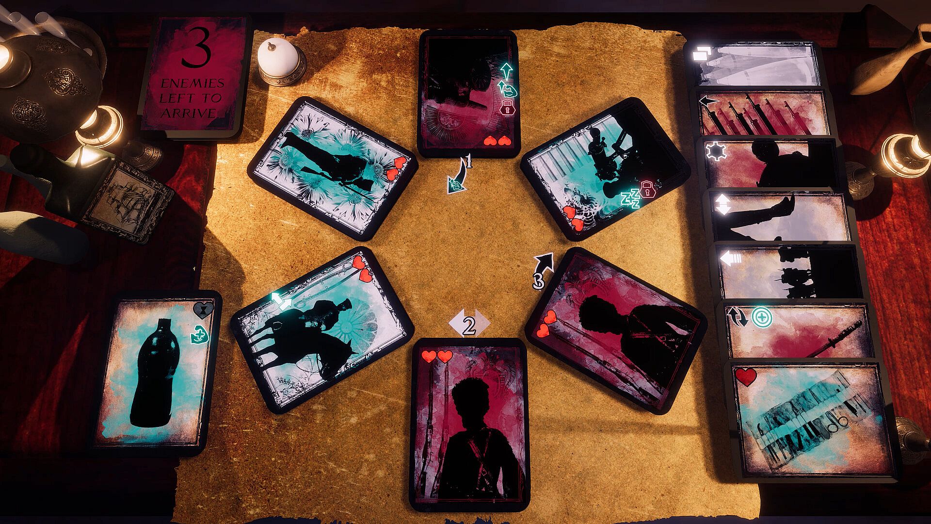 In Sonsgorod, the game board is circular, and what you can do depends on where you are. Attacking often isn't the best play, but by swapping and moving cards, you can set up maneuvers, turn enemies against one another and emerge victorious.